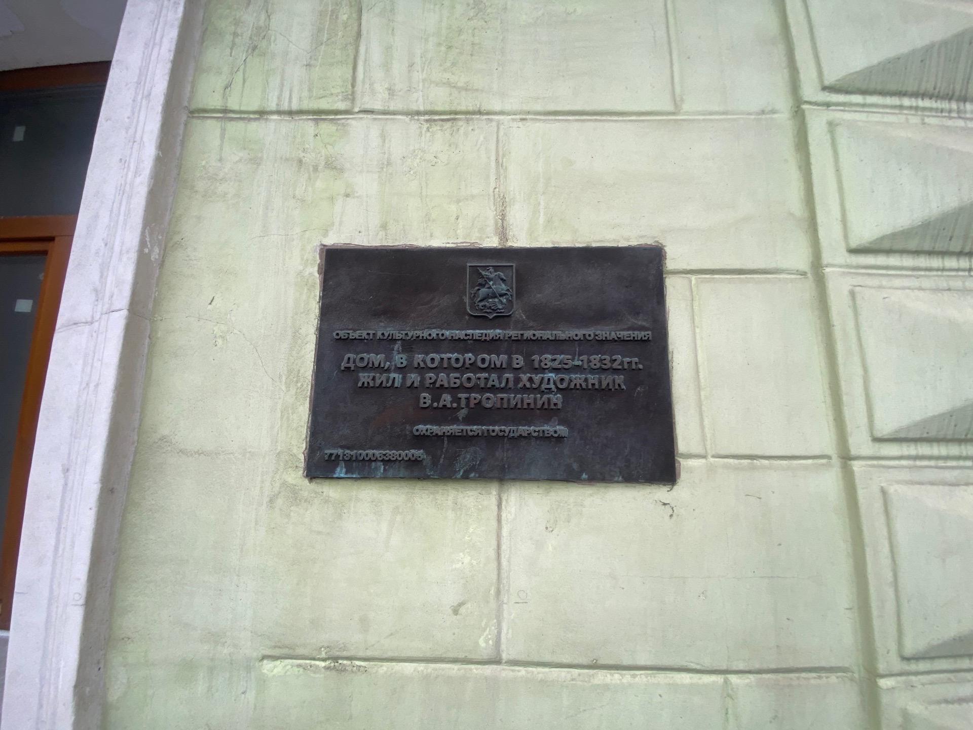Парадокс: мемориальная доска, посвященная знаменитому художнику, укреплена на доме № 9, построенном по проекту архитектора М.И. Никифорова через 21 год после смерти Тропинина, в 1878 году, на месте главного дома усадьбы, в котором живописец никогда не жил.