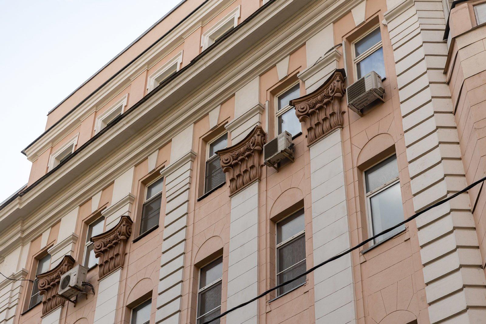 При перестройке 1930-х гг. дом получил свой нынешний импозантный облик в стиле "советского неоклассицизма", соответствовавший идеям Генерального плана Москвы 1935 года. Фасады вдоль Леонтьевского и Елисеевского переулков украшены пилястрами "гигантского ордера", зрительно объединяющими 2–5 этажи; нижний этаж трактован как цокольный и отделан рустом. Из неоклассической стилистики несколько выбивается отмечающий угловую часть дома эркер – это "наследство" доходного дома XIX – начала ХХ века. В 1970 году дом был реконструирован с заменой перекрытий на железобетонные.