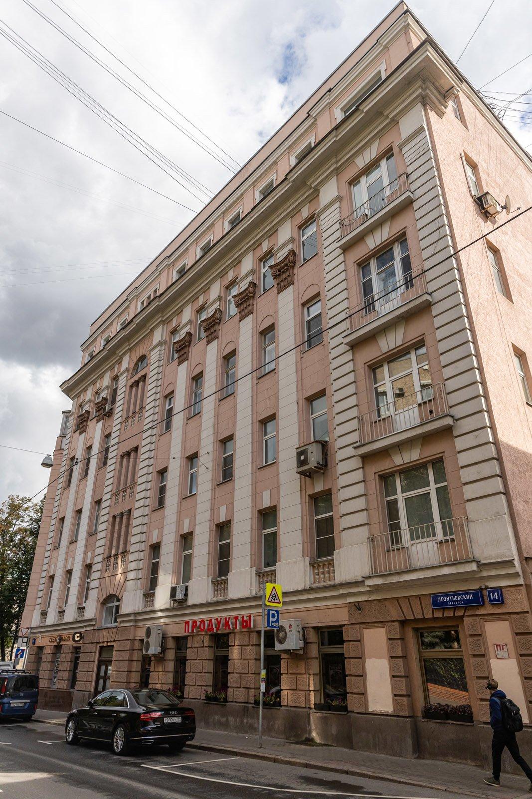 Дом на углу Леонтьевского и Елисеевского переулков, как и многие дома-старожилы центра Москвы, искусно скрывает свой возраст. Его биография словно законспектирована в длинном официальном названии здания ("Доходный дом — жилой дом ЖСК "Союзстандартжилстрой" (1820-е; 1886, 1892, архитектор В.П.Загорский; 1912—1913, архитектор А.П.Белоярцев; 1932–1936; 1970, архитектор М.А.Посохин. В доме жили певица Татьяна Шмыга, певец Муслим Магомаев»), которое является ценным градоформирующим объектом.