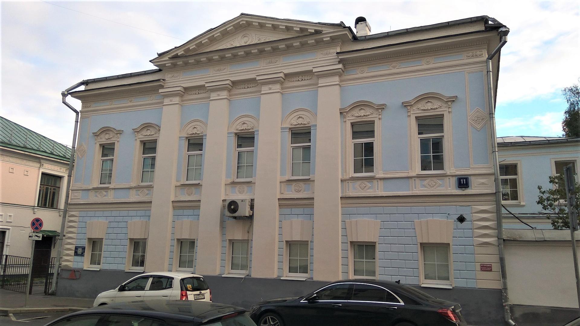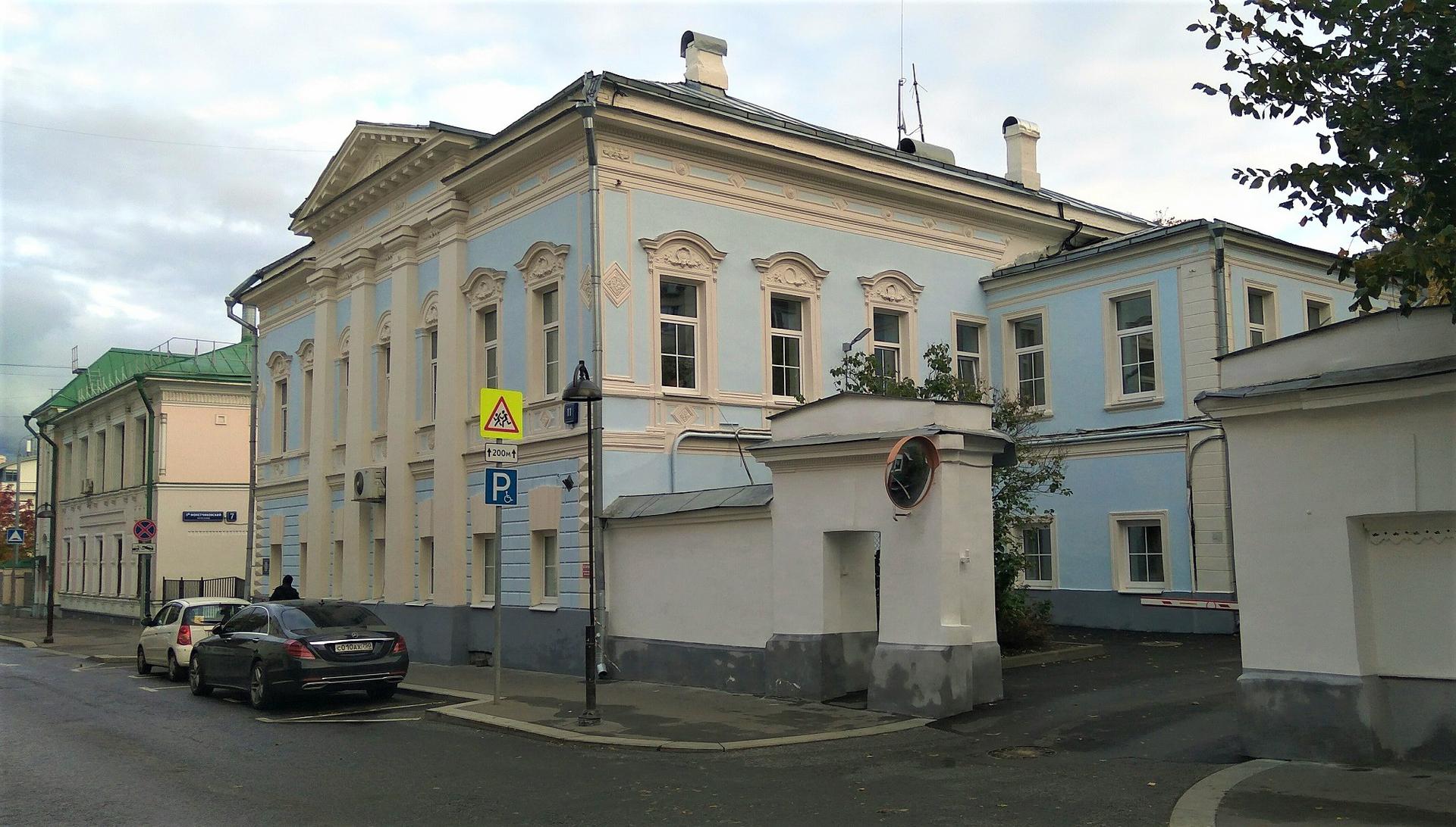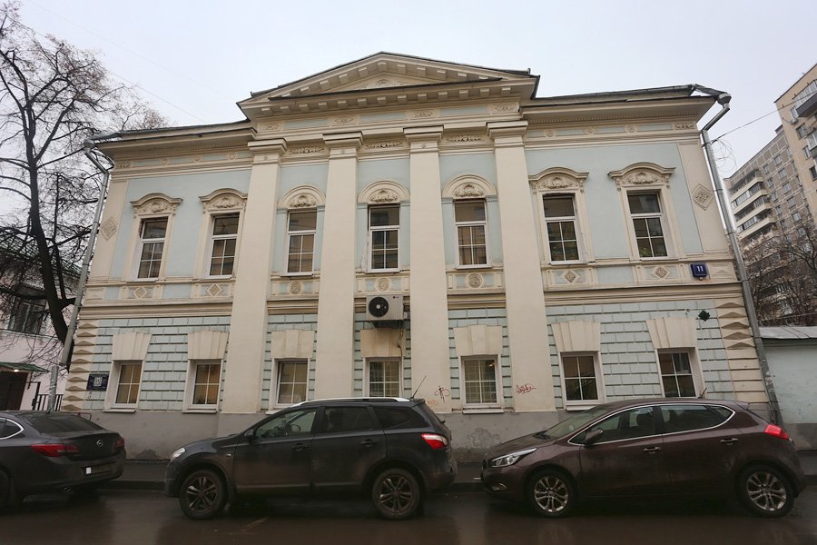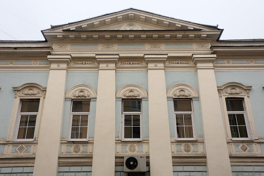 Этот дом сегодня самый старый в своём переулке. Он был построен в конце XVIII века и с того времени не сильно изменился. Четыре пилястры большого ордера несут небольшой фронтон и от этого кажутся крупнее, чем они есть на самом деле. Недавно, до последней покраски фасада, было видно, что пилястры сложены не из кирпича, а из блоков хорошо отёсанного белого камня. Это придавало им дополнительную монументальность. В период между 1838 и 1864 годами на фасаде появилась измельчённая лепнина, наличники из мелкого штукатурного профиля, руст во втором этаже. Видимо, тогда же было изменено оформление парадной лестницы.
