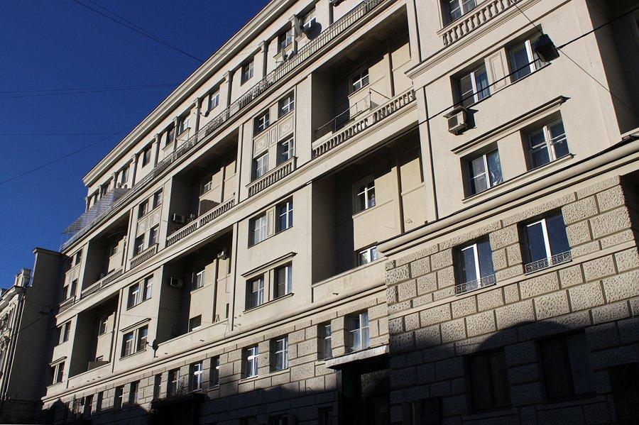 Новый монументальный дом, растянувшийся почти по всему переулку, строился в 1935-1938 годах по проекту архитекторов В.Н. Владимирова и Г.И. Луцкого. Это был яркий представитель нового поколения зданий: дом как синтез искусств.