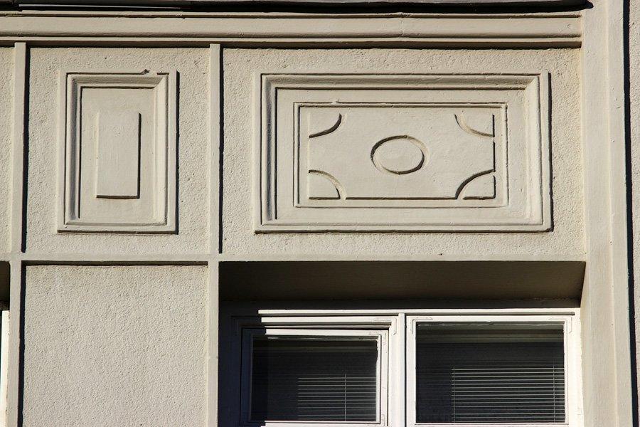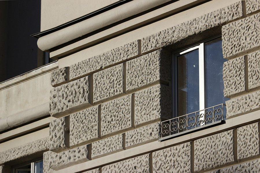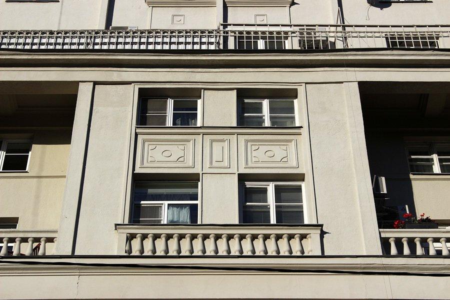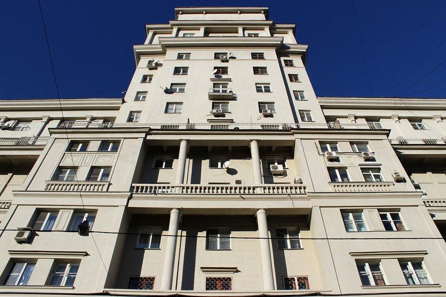 Восьмиэтажный корпус построен с отступом от красной линии, на главный фасад выходят ряды удобных лоджий, а вдоль седьмого этажа тянется непрерывная лента балконов. Парадные подъезды оформлены черным мрамором. Порталы нарядно украшены цветочными гирляндами, выполненными в технике сграффито.