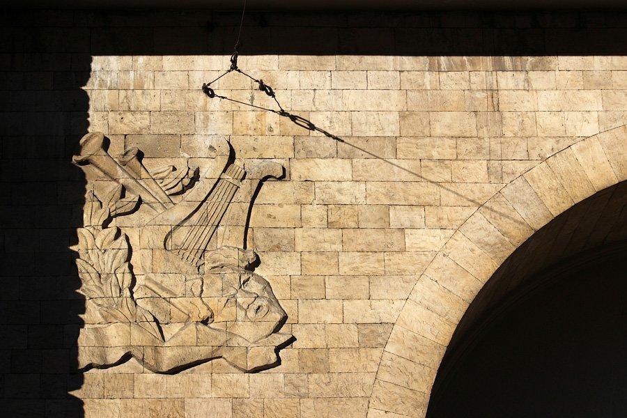 Над основным корпусом дома возвышается тяжелая четырнадцатиэтажная башня, ступенчато поднимающаяся вверх. В нижней части башни – дворовая проездная арка, создающая впечатление триумфальной. Так как дом сразу предназначался для артистов, скульптор Г. Мотовилов создал барельефы, посвященные культурному отдыху трудящихся – «Карнавалу искусств» (левый), и правый – «Параду физкультурников».