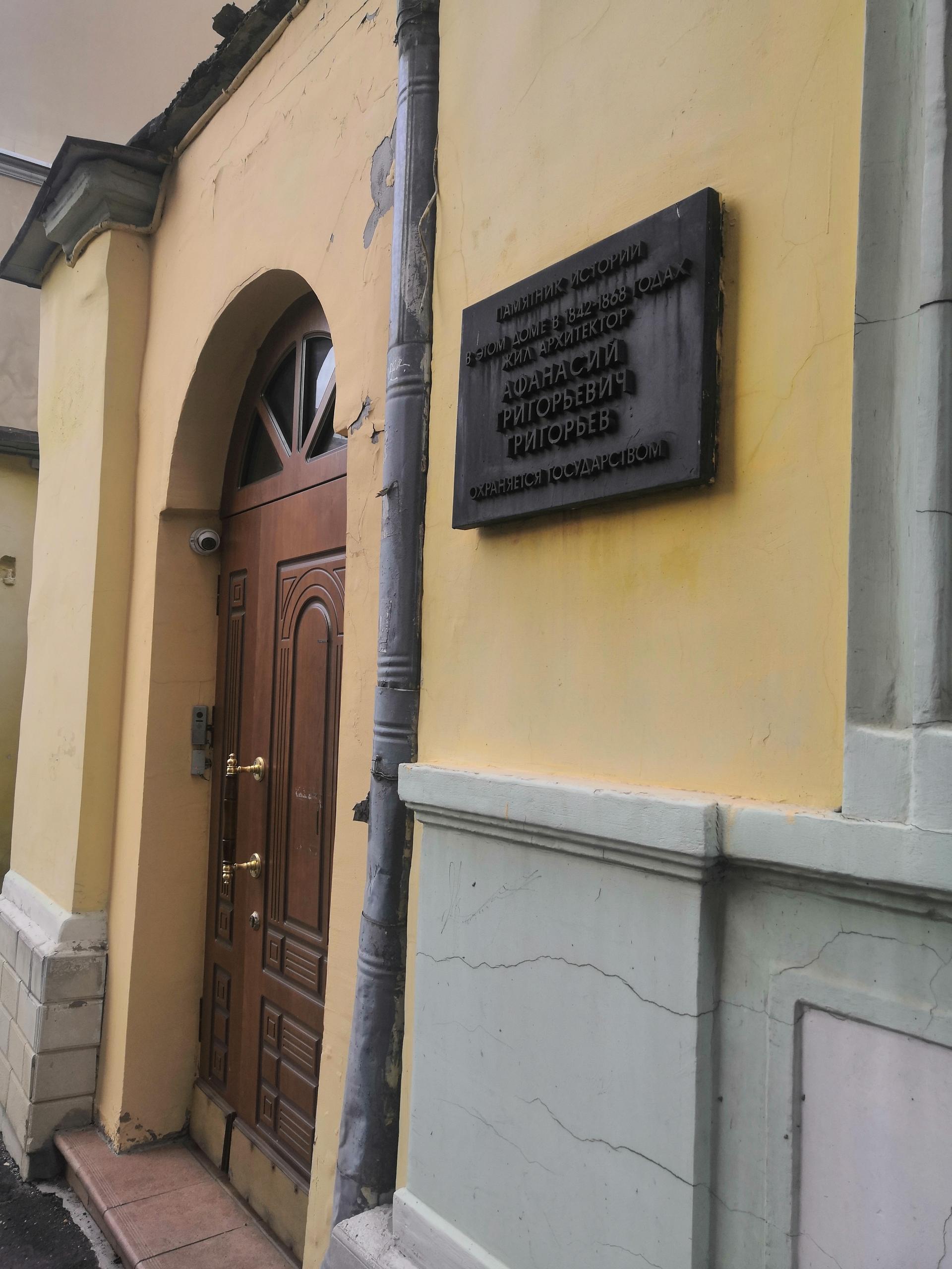 В начале переулка сохранился почти неприметный особнячок. Это дом архитектора Афанасия Григорьевича Григорьева, построенный им для себя и своей семьи.