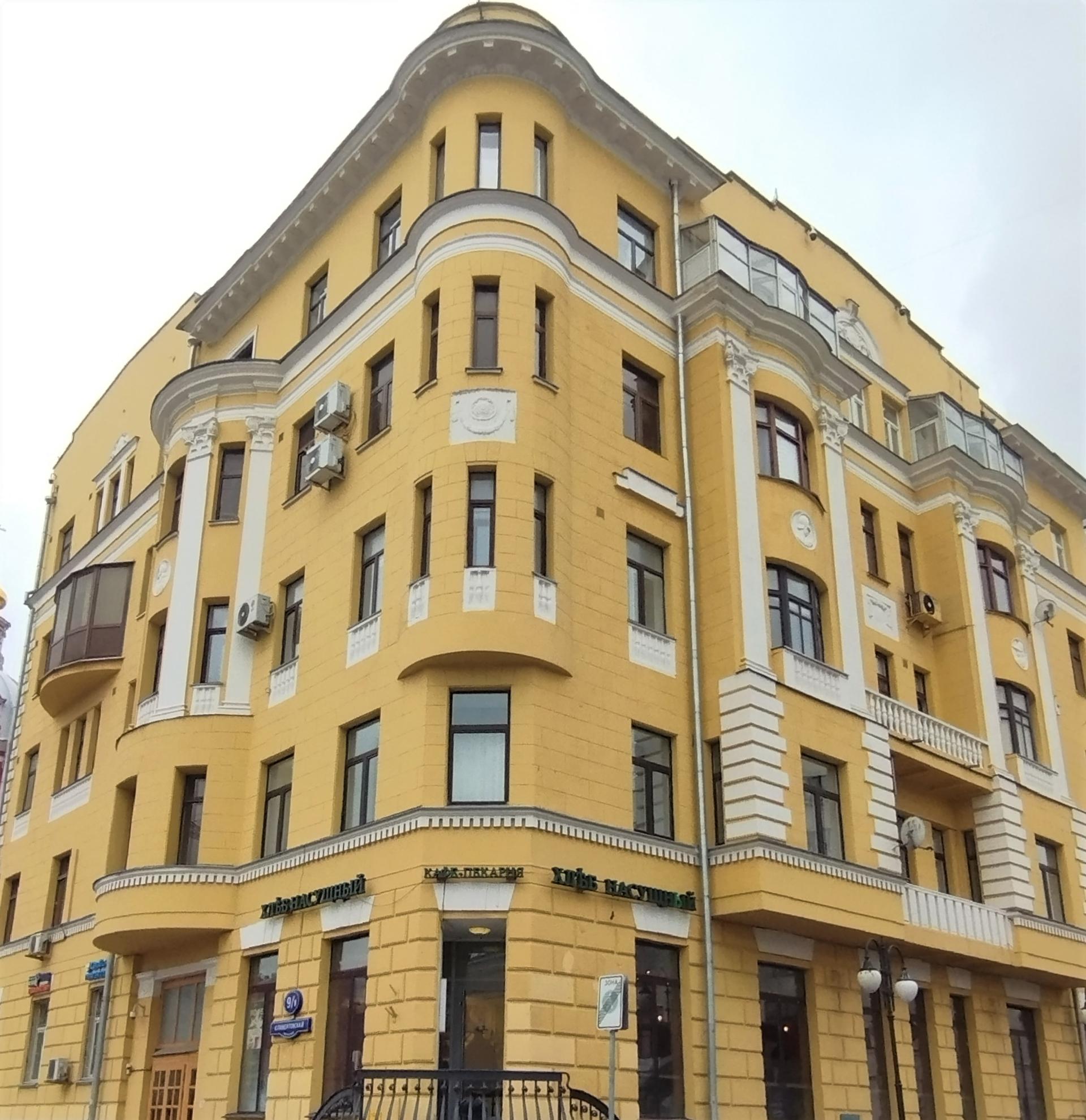 Афанасий (Афроим) Моисеевич Эберлин был доктором медицины, приват-доцентом университета, врачом Голицынской больницы, а ещё – статским советником. Свой дом он строил в соответствии со своим образом жизни. Поднятый на высокий полуподвал первый этаж в нём занимали две больших квартиры для состоятельных людей, готовых снять их за большие деньги. Второй этаж занимала собственная гинекологическая клиника доктора Эберлина. Здесь был родильный приют со стационаром, операционная, просторные палаты. Всё было приспособлено для приёма состоятельных пациенток. В третьем этаже было устроено две квартиры. В них жила семья самого доктора и его родственники. Четвёртый этаж был с тремя квартирами поменьше, они сдавались внаём. Небольшие комнаты пятого этажа доктор предназначал для не слишком обеспеченных студентов и художников. На чердаке был оборудован зимний сад хозяина со стеклянной крышей в форме палатки. Эта крыша есть и сейчас, только давно уже не стеклянная, а покрытая жестью.