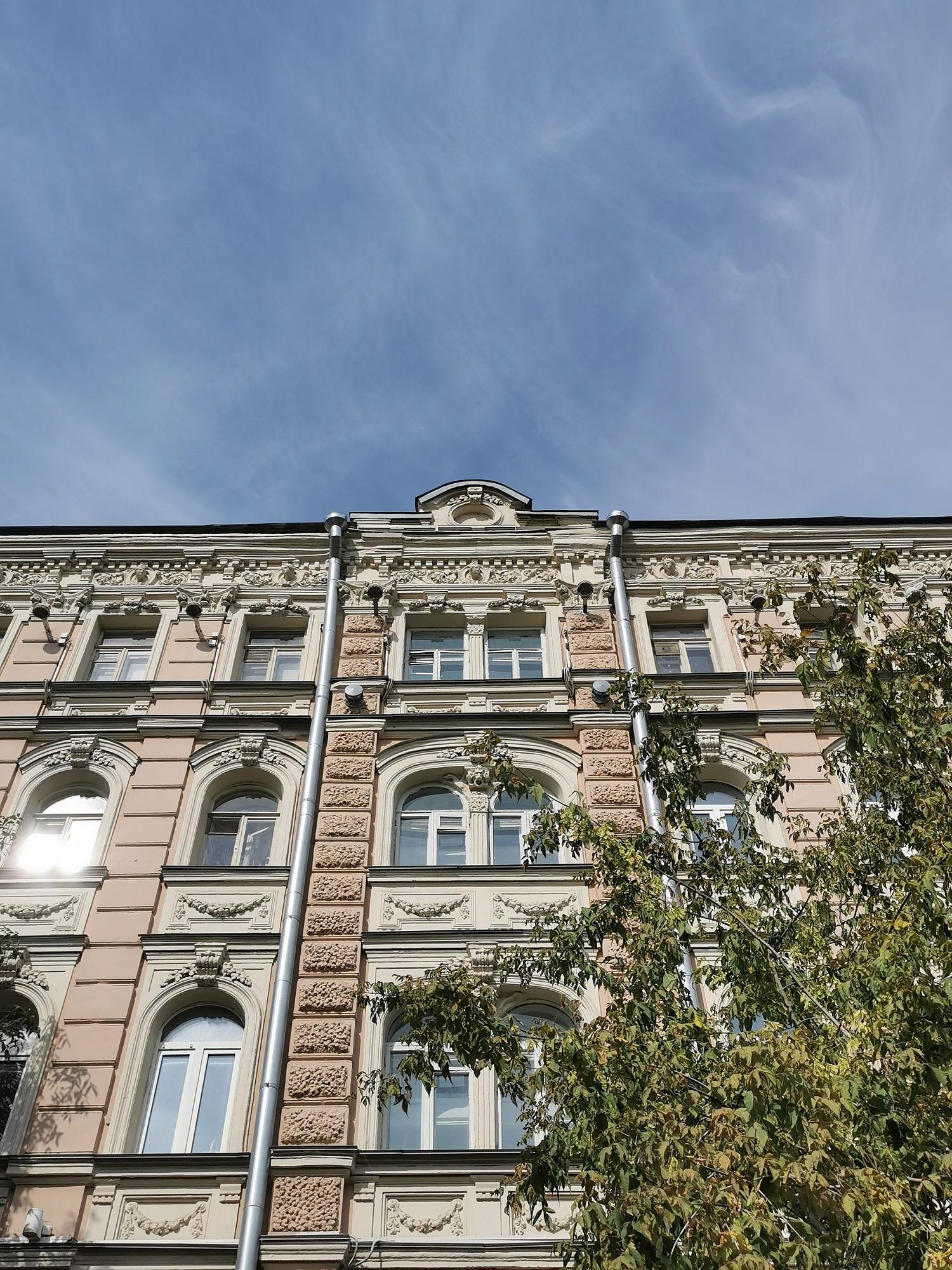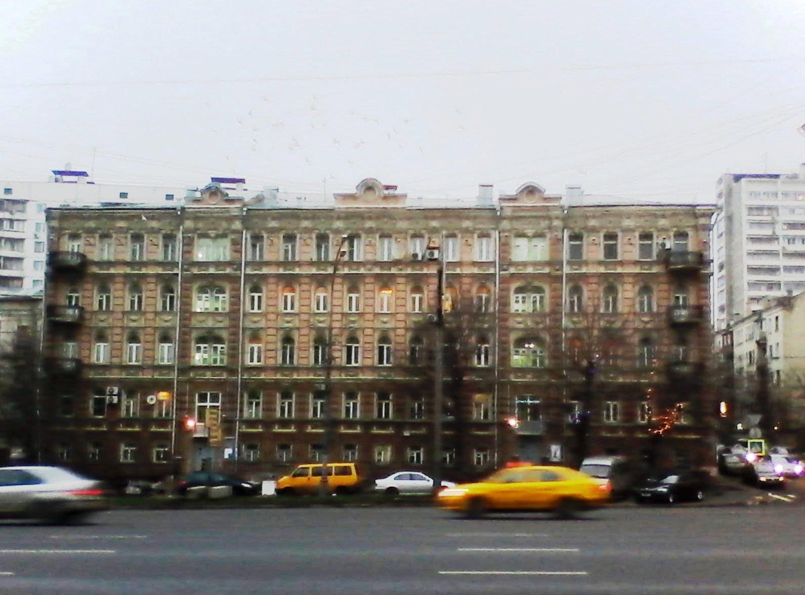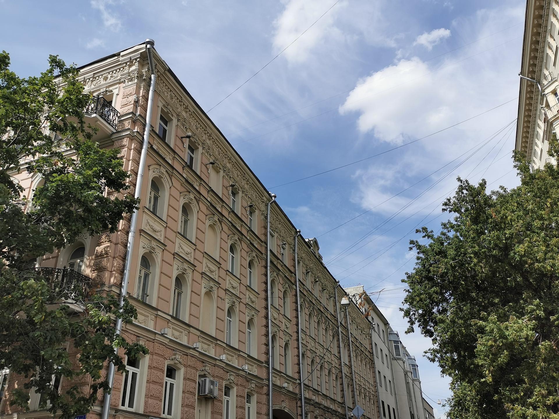 Сейчас кажется невероятным, но это небольшое пятиэтажное розоватое здание в стиле эклектики — один из первых многоэтажных доходных домов Москвы конца ХIХ века. Владелицей дома была немка Клара Кирхгоф.