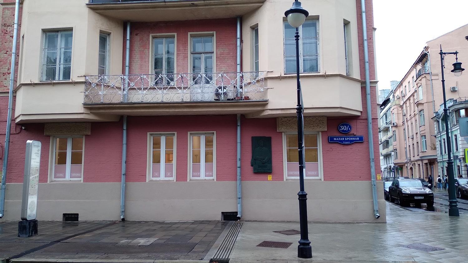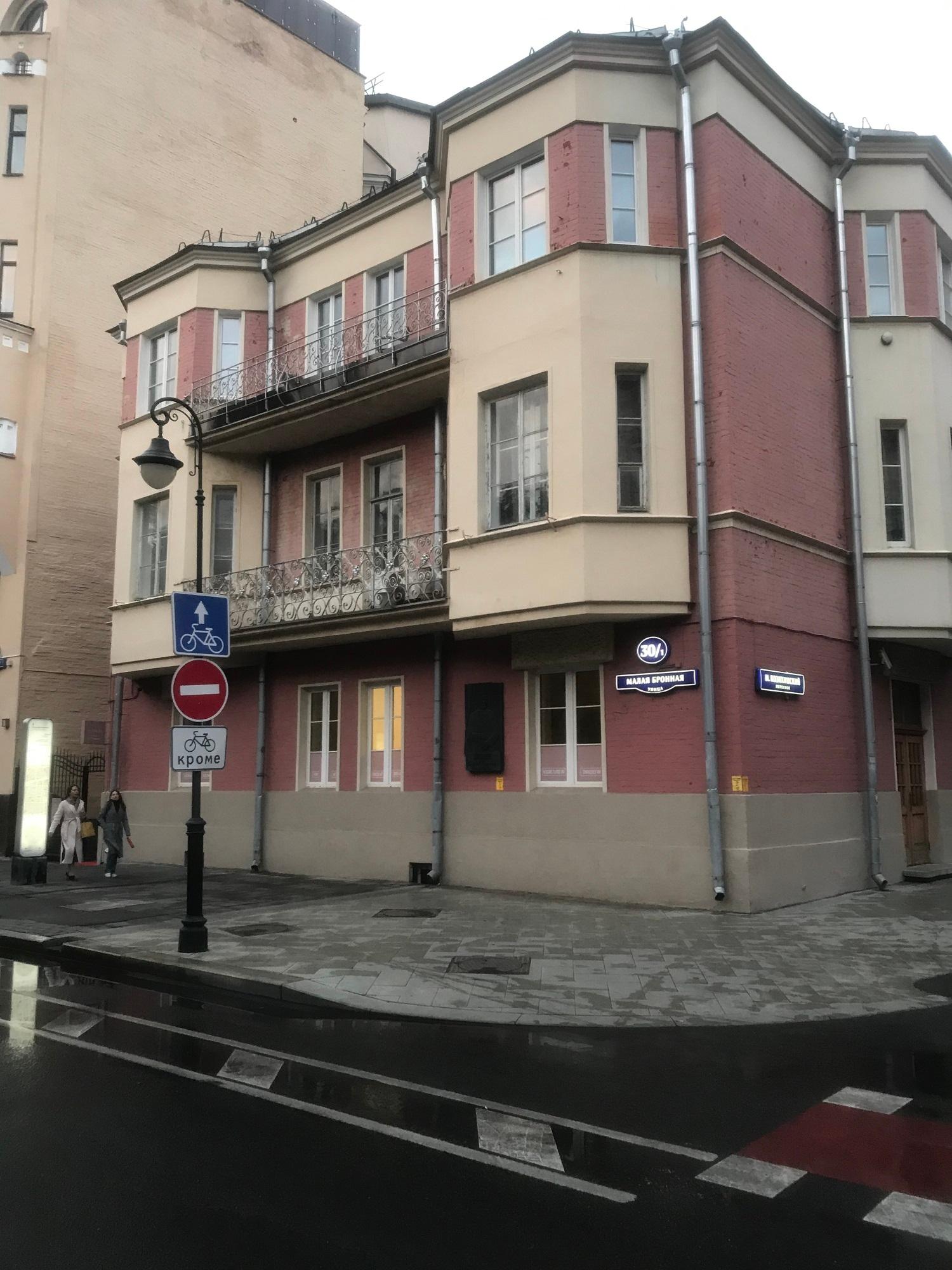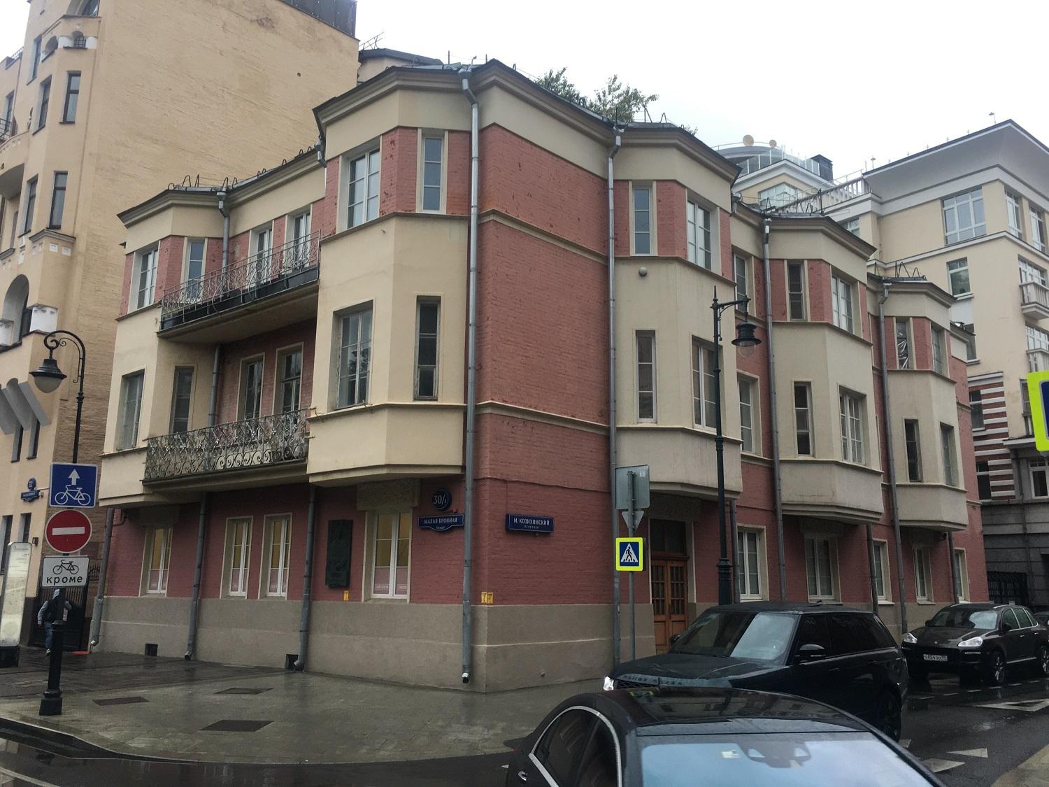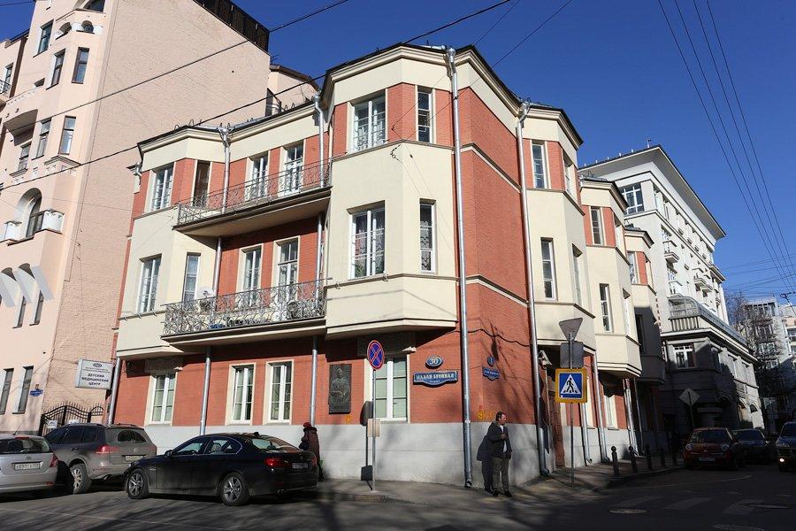 Небольшой кирпичный домик с отштукатуренными вставками на Малой Бронной — одно из немногих воплощенных в жизнь творений архитектора.