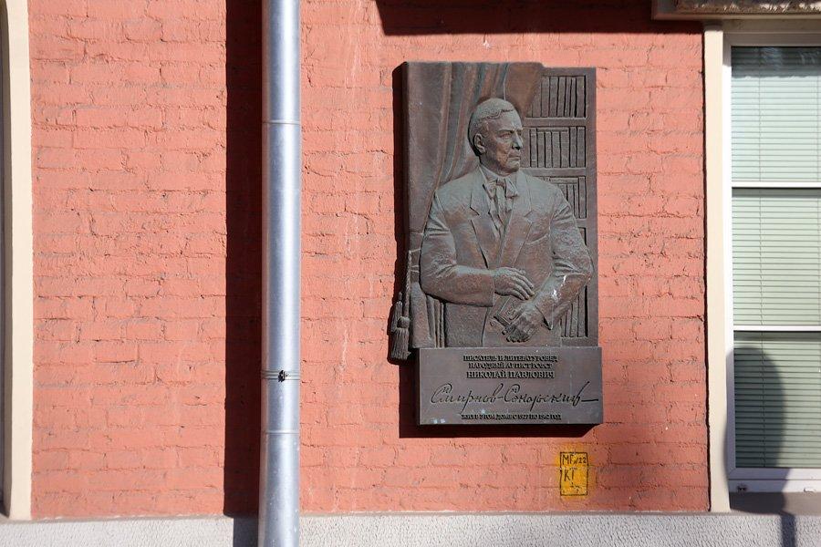 Здесь долгие годы жил артист и библиофил Н.П. Смирнов-Сокольский, о чем говорит мемориальная доска на стене дома.