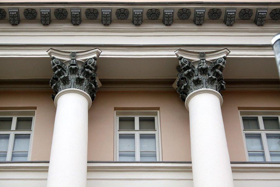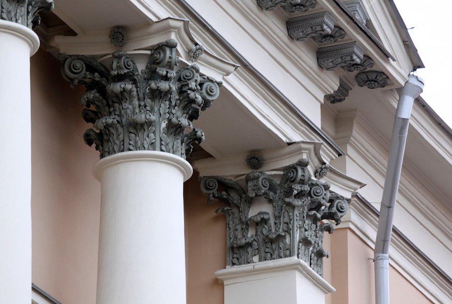 Монументальное строение главного дома Губина поднимается над Петровкой тремя этажами. Фасад украшен фронтоном, поддерживаемым рядом колонн коринфского ордена, которые не выступают от стены. По обеим сторонам от центрального объема расположены двухэтажные крылья, имеющие с основным зданием общую стену. Для украшения их фасадов зодчий использовал малый ионический ордер с легкими скульптурными композициями.