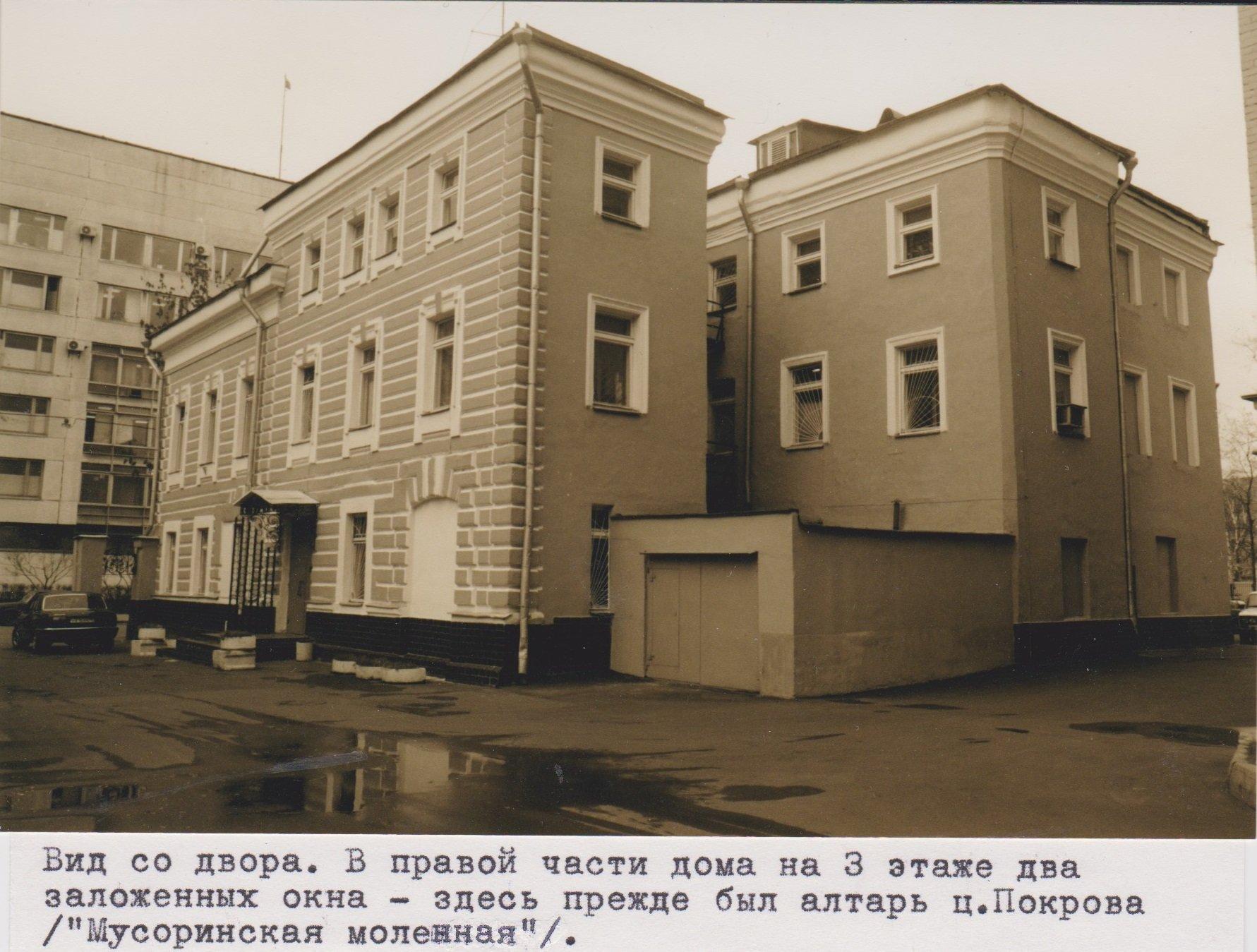 Это домовладение принадлежало Мусорину Федору Михайловичу - московскому купцу 1-й гильдии, состоявшему в купечестве с 1868 года. Он был видным деятелем московского старообрядчества – попечителем Рогожского Богадельного дома. 2 июля 1867 года им было приобретено данное домовладение, в 1884 году рядом был построен сохранившийся до сегодняшнего дня главный дом (арх. Максим Карлович Геппенер). В 1903 году именно в этот дом, на третий этаж была перенесена церковь во имя Покрова Богородицы, находившаяся на территории домовладения с 1873 года, которая фактически служила церковью Замоскворецкой старообрядческой общины до 1910 года.