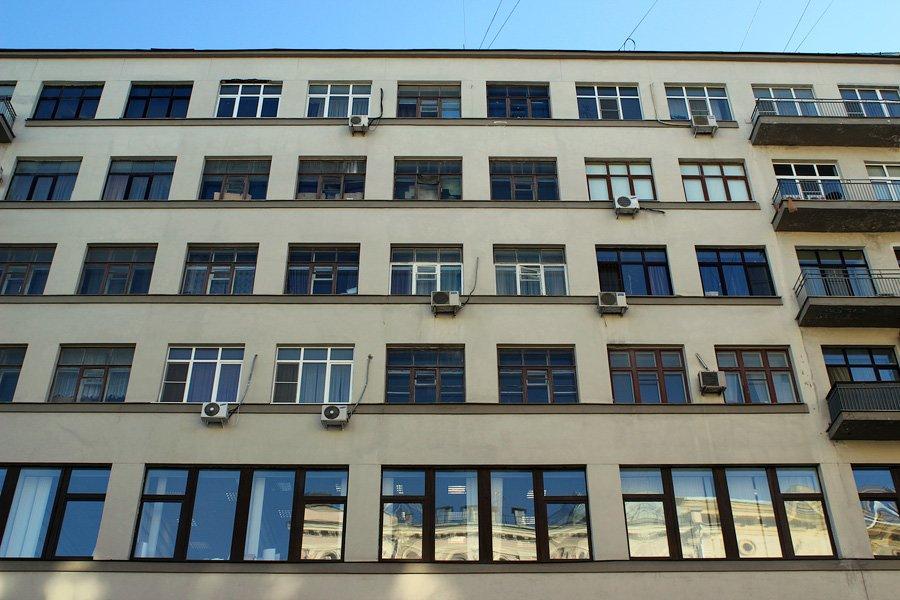 Первые три этажа отличаются от следующих четырех. Лаконичный главный фасад, огромные окна, их линейное расположение, легкие балконы, расположенные симметрично – все эти детали говорят о том, что здание строилось в стиле конструктивизма.