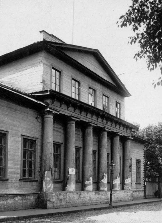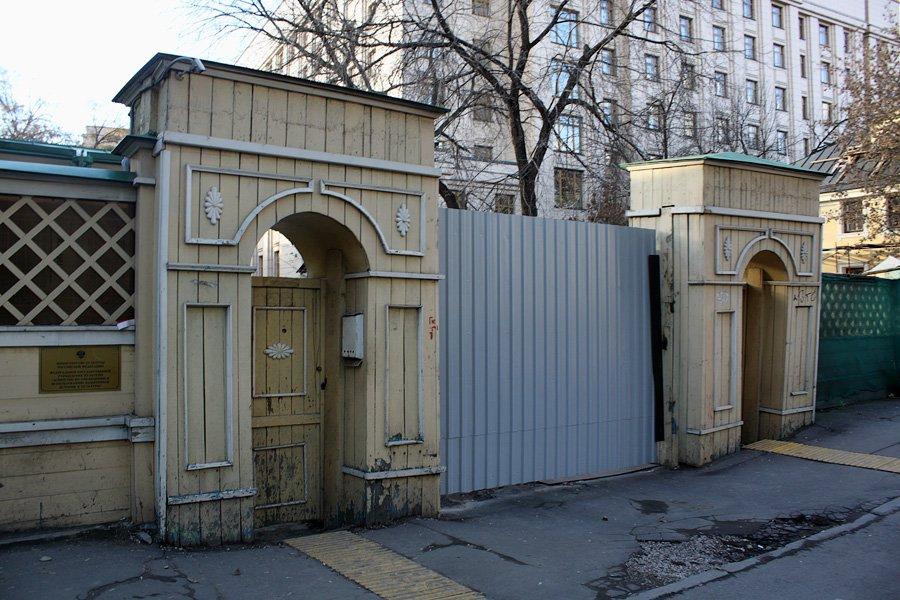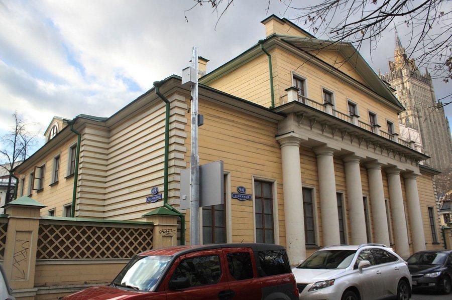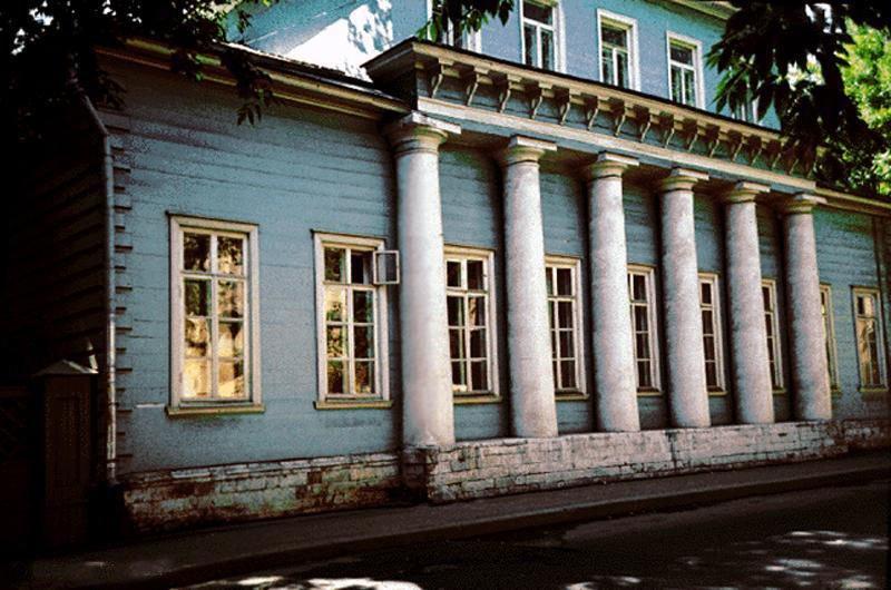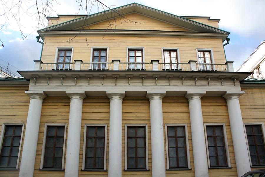 Одноэтажный деревянный дом с колоннами на парадном фасаде и с мезонином был построен архитектором Григорьевым после пожара Москвы 1812 года. Дом полностью деревянный, однако заделан «под камень». Любопытно, что в античные времена классические ордерные формы были деревянными, после перешли в камень и только в послепожарной Москве снова обрели деревянную фактуру! Для более фешенебельного вида уютные деревянные особнячки обкладывали специальными досками с выемками, имитирующими камень. На специальном рынке даже продавались филенки с гипсовой лепниной и элементы деревянных колонн! Согласно нормам тех лет, владелец платил налог за дом по количеству этажей уличного фасада. Отсюда любовь московских домовладельцев к мезонинам. За такую якобы нежилую антресоль платить было не надо.