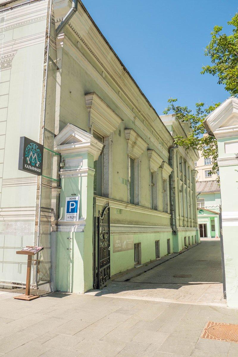 Эта сторона Страстного бульвара оформилась владениями после пожара 1812 года. Небольшие особнячки чаще всего стояли вдаль красной линии улицы, а за ними располагался небольшой садик. Некогда особняк занимал доминирующее угловое положение между бульваром и несуществующим ныне проездом, и именно этим объясняются его Г-образная конфигурация и наличие двух разных, но одинаково нарядных фасадов. Южный, с двухколонным портиком, обращен к Страстному бульвару, восточный, с портиком из шести пилястр в сторону ул. Петровки.