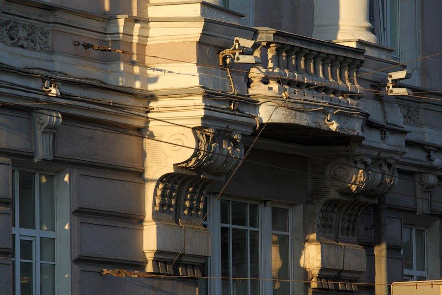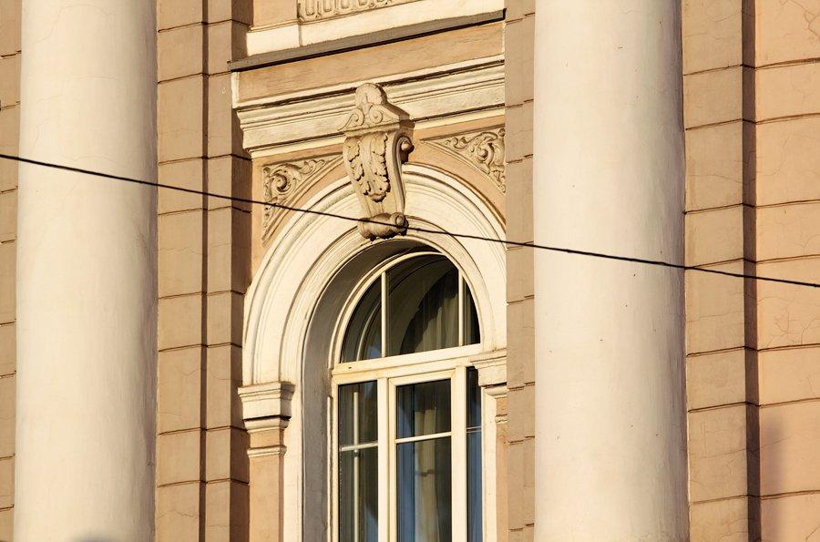 Своим длинным фасадом здание выходит на железнодорожную соединительную ветку. Трехчастную композицию этого фасада оформляют четырёхколонные портики гигантского ордера средних двух этажей центрального и боковых ризалитов, которые опираются на антаблемент из волют. При гладком цоколе все фасады здания имеют ярко выраженный руст. Наличники окон второго и третьего этажей более мощные, чем первого и последнего, и выделяют среднюю линию фасада, что присуще классическим зданиям. На окнах всех уровней присутствуют замковые камни разного декора – гладкие на верхнем этаже, и имеющие волюты с растительным орнаментом на втором и третьем.