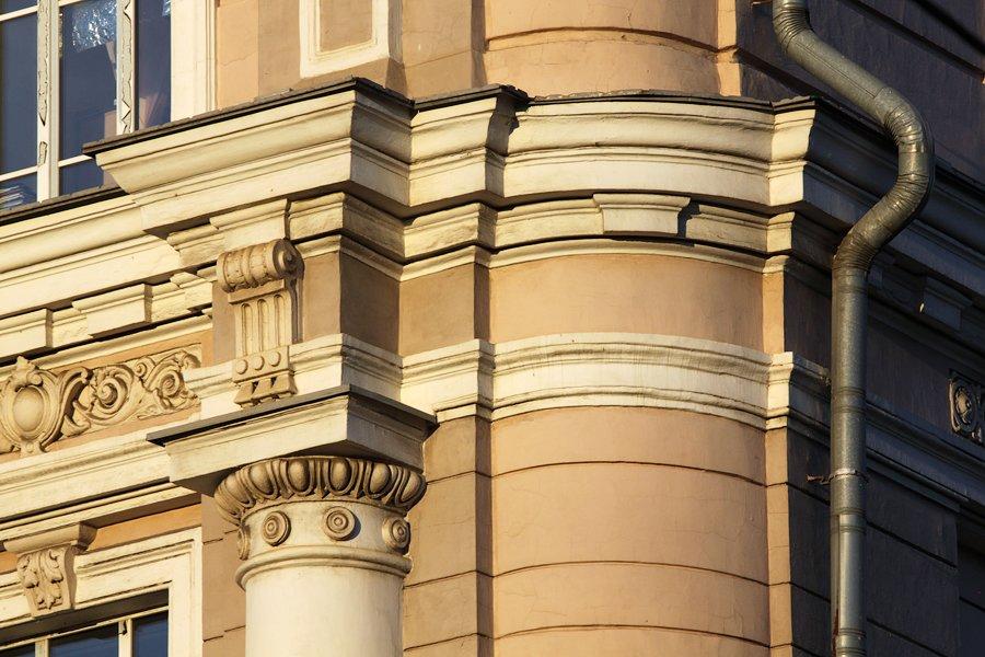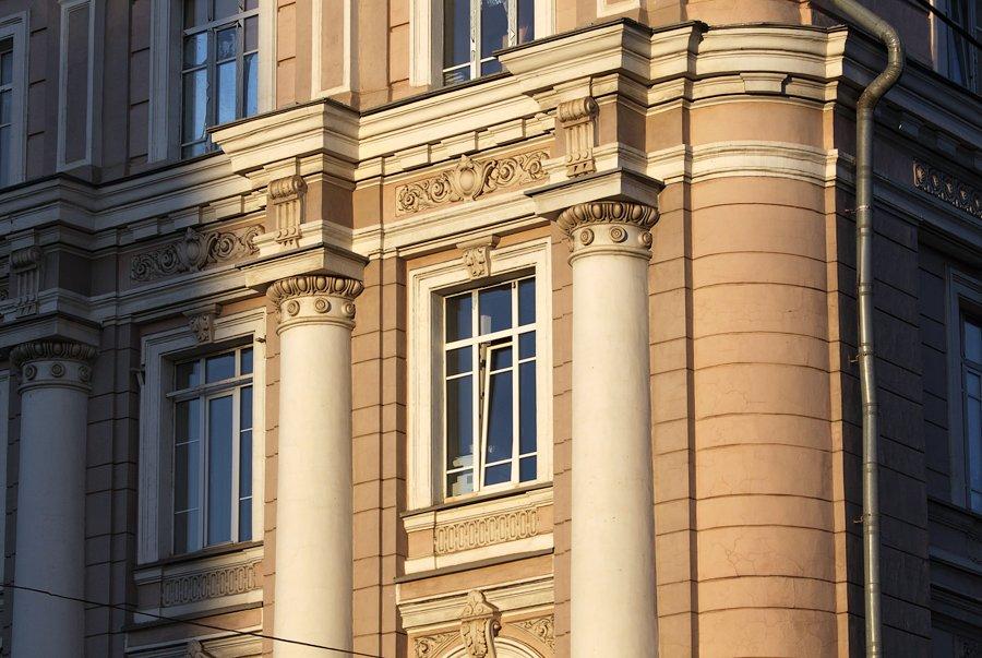 Фасад, выходящий на Старую Басманную улицу, оформлен двухколонным портиком с небольшим балконом между ними.
