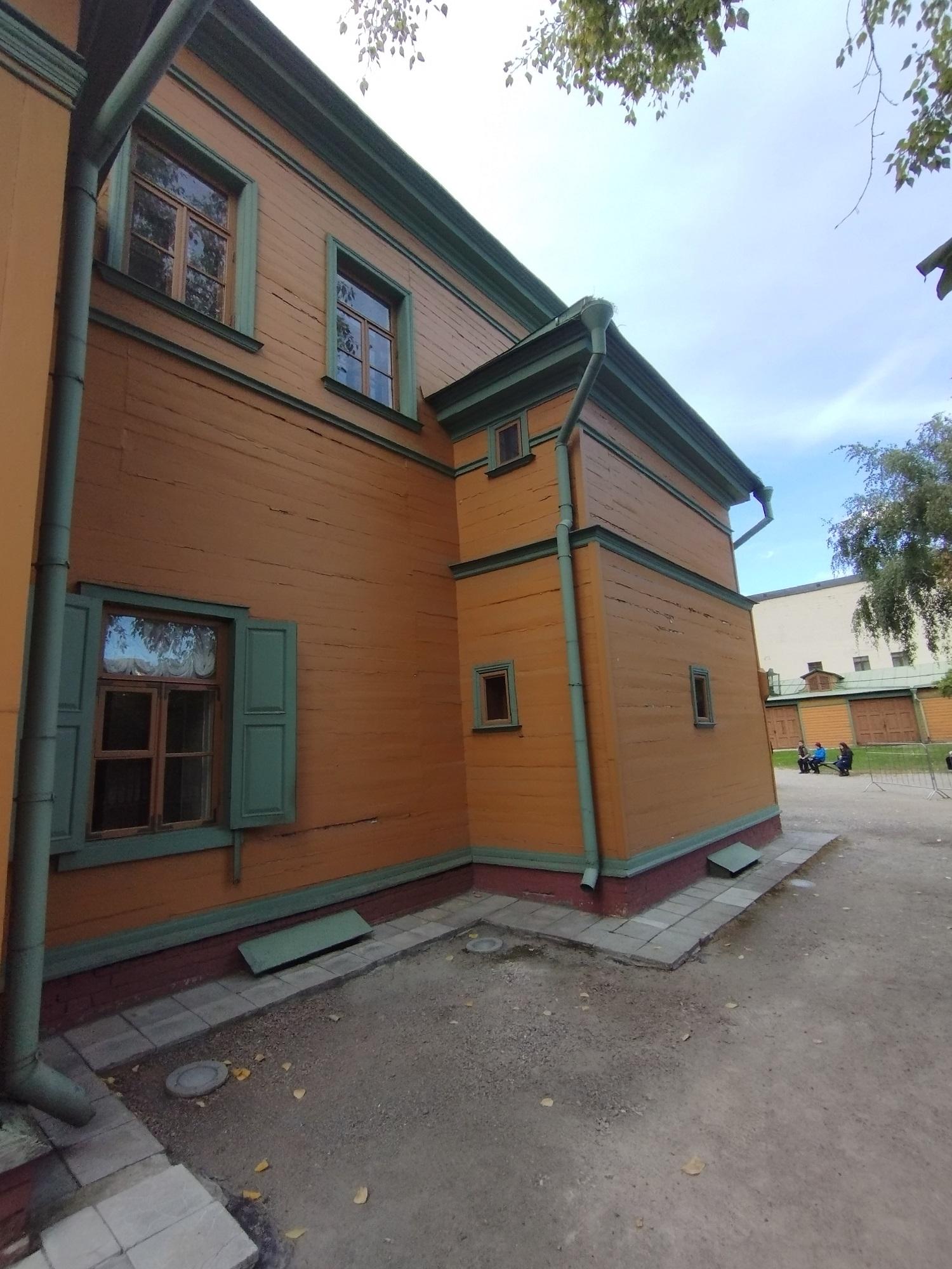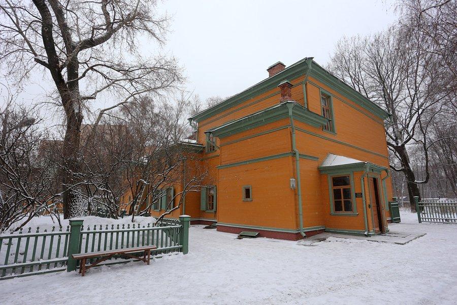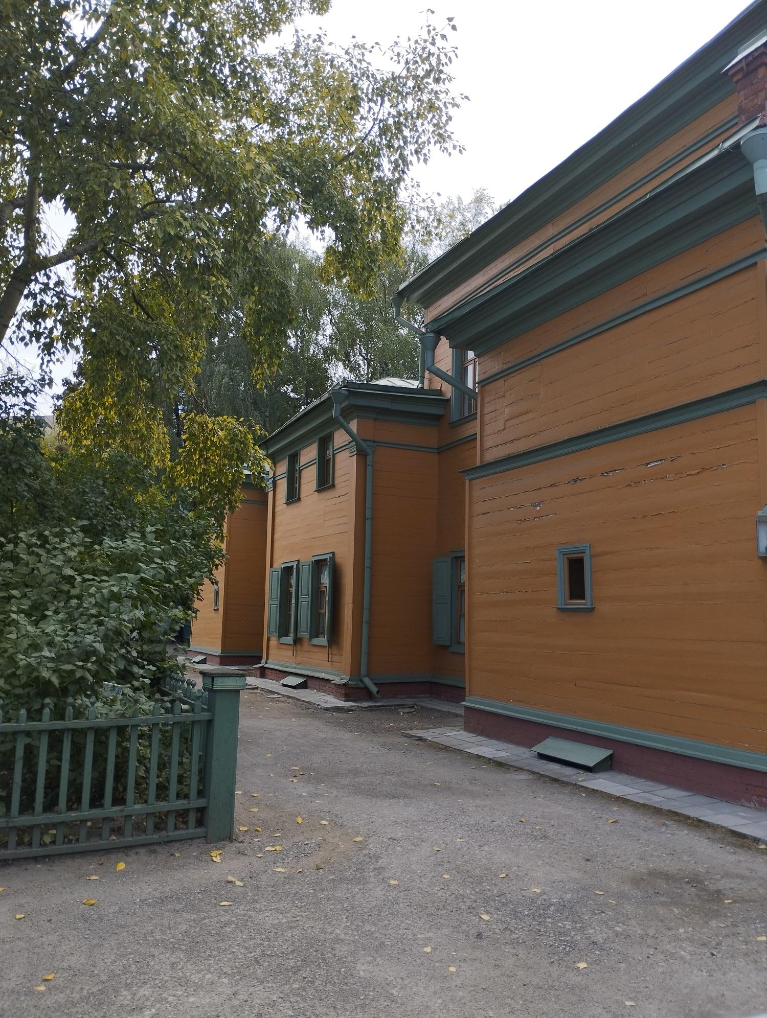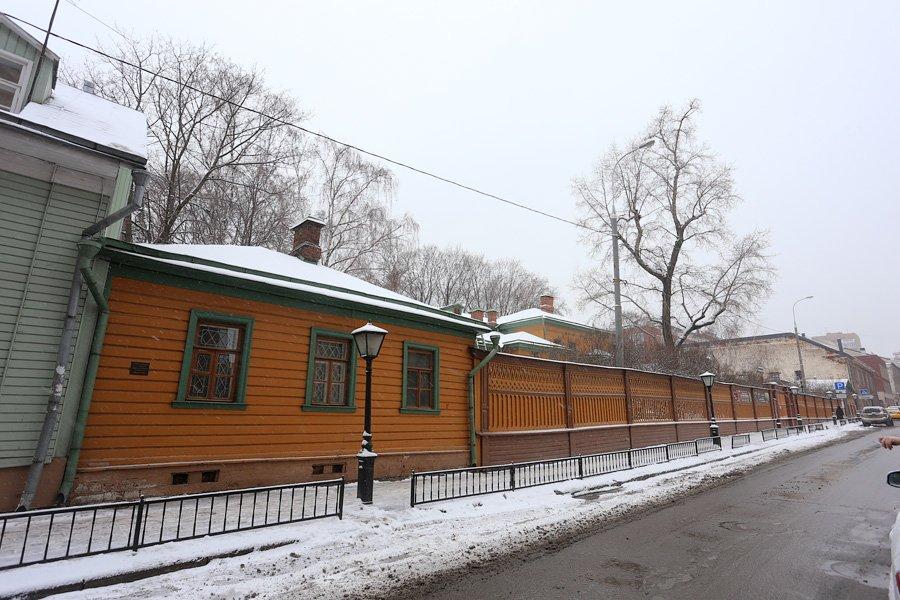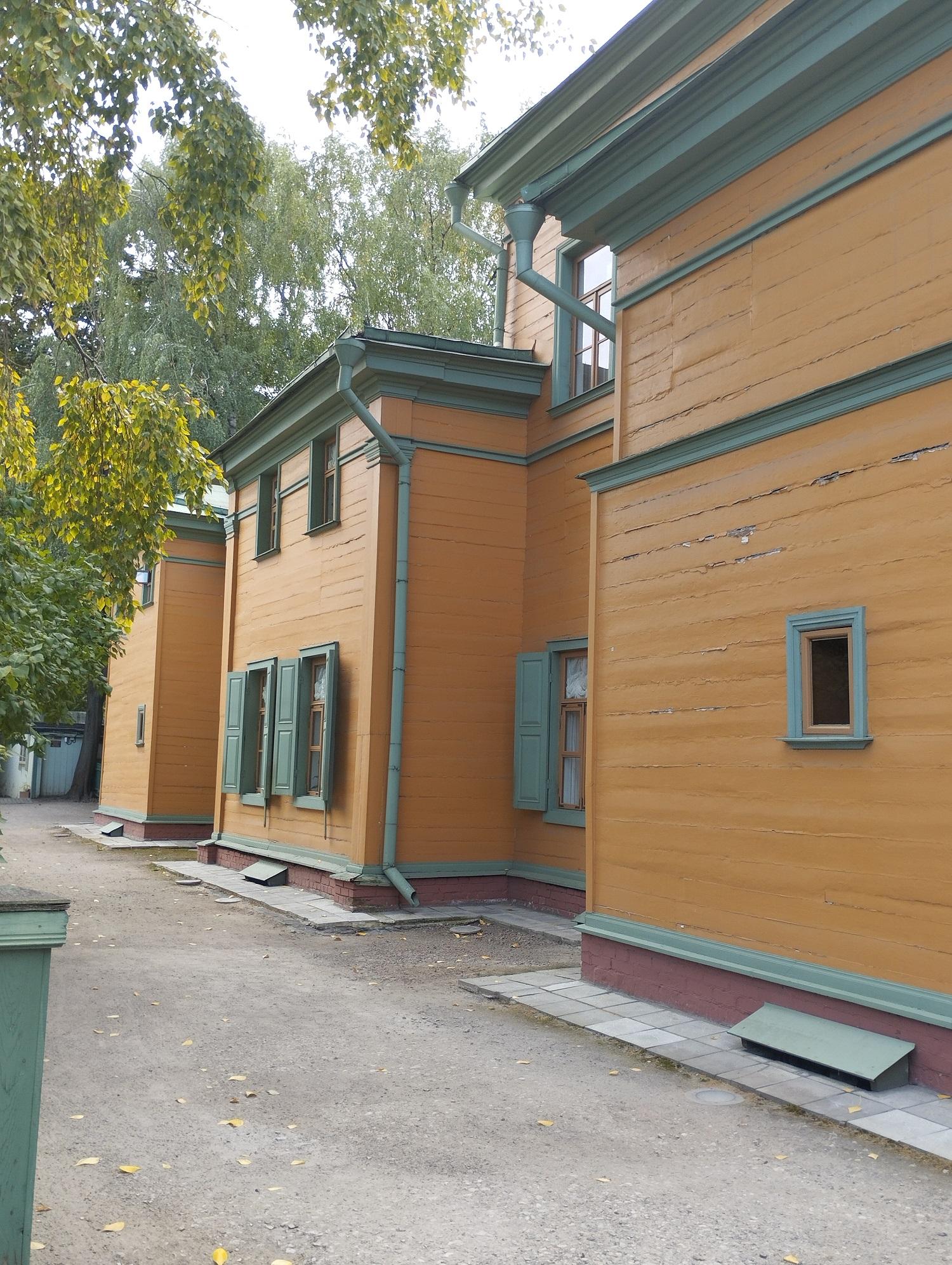 Усадебный дом был старинный, деревянный. Его пощадил московский пожар 1812 года. Так он и стоит, огороженный затейливым деревянным забором, такой же, как и в 1805 году, когда его построили. Вокруг усадьбы сохранились дворовые службы и даже кусочек прекрасного сада, который некогда простирался между Долго-Хамовническим и Олсуфьевским переулками.