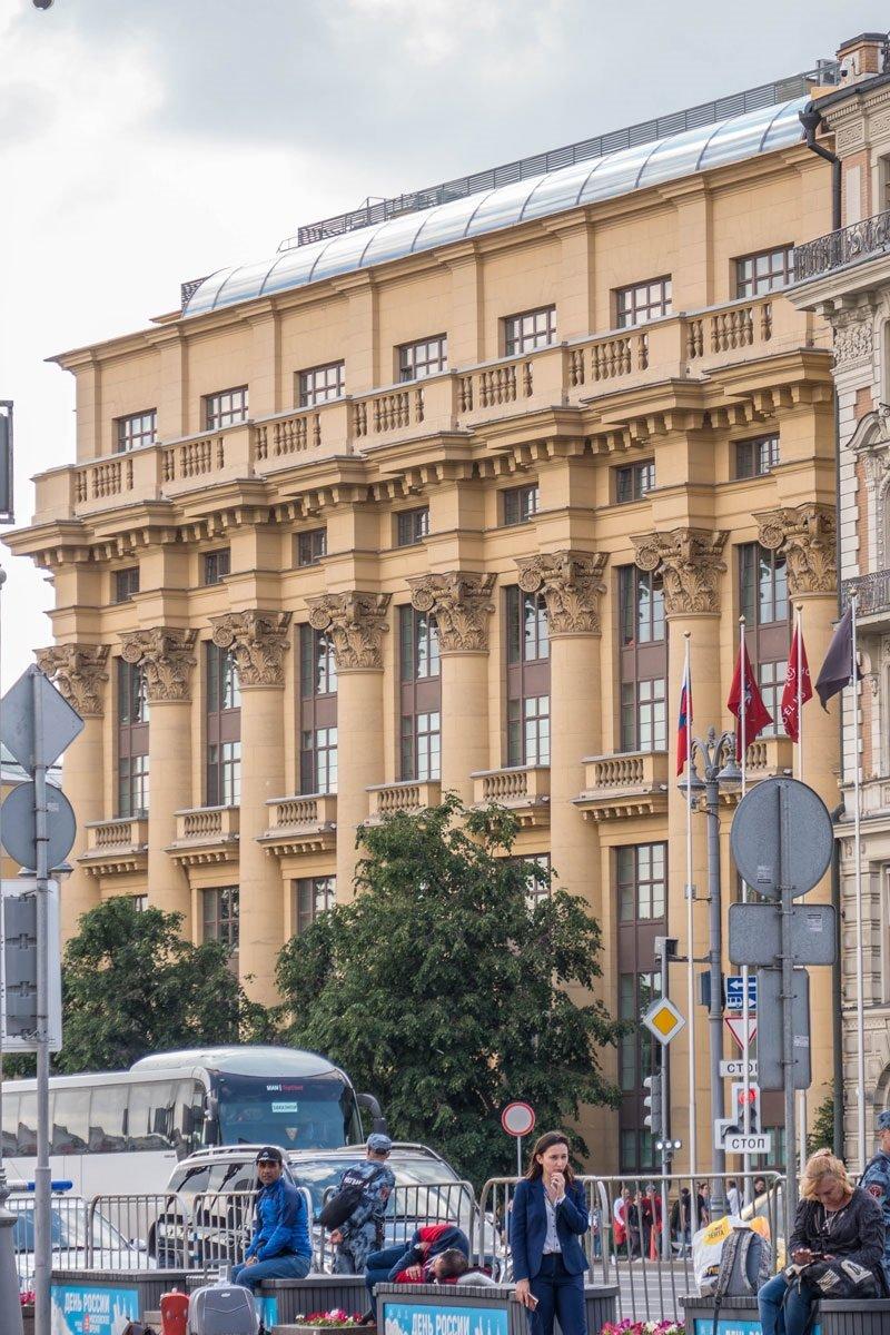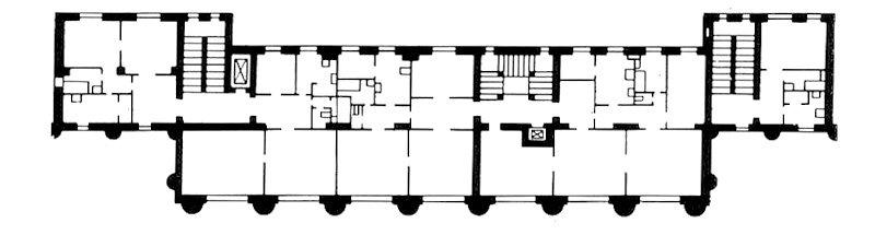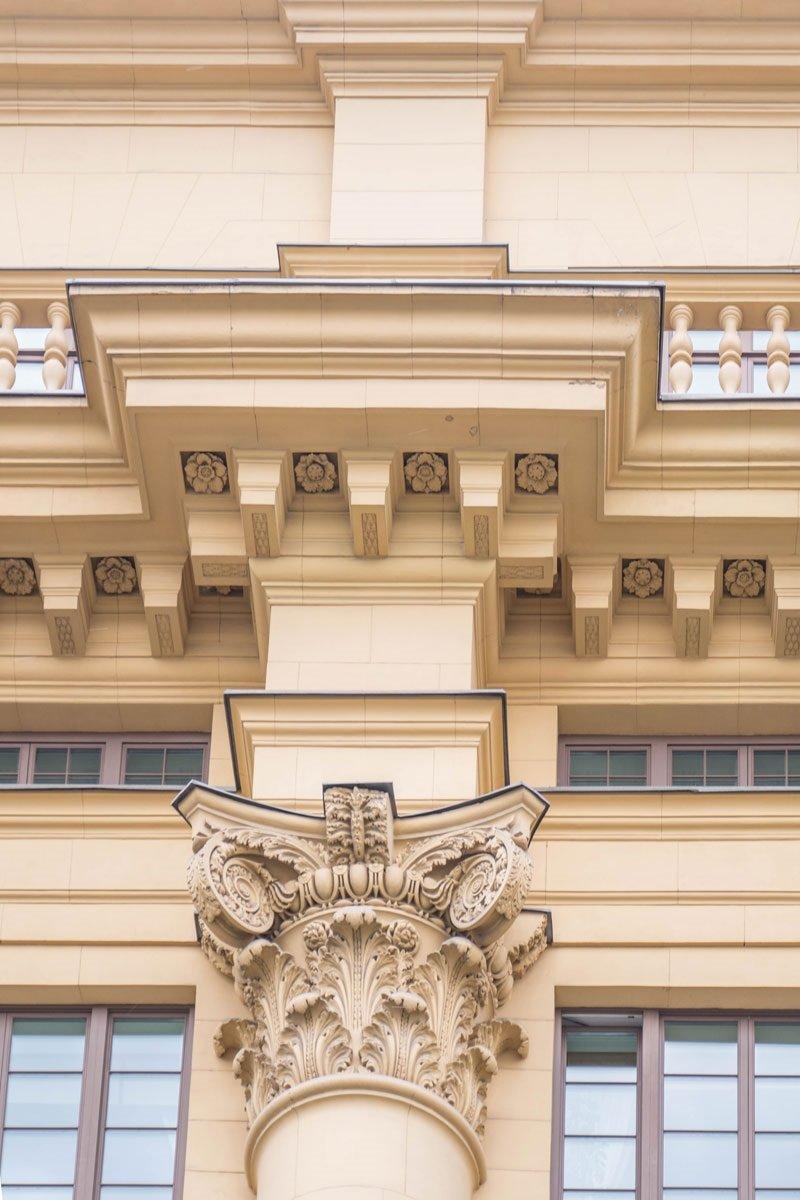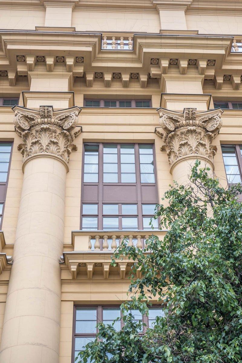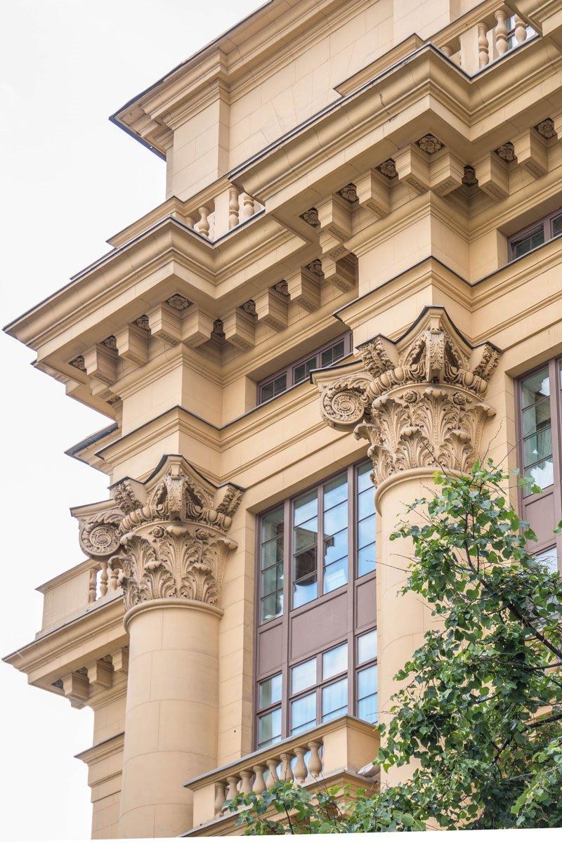 Сильно выступающий карниз, служит основанием для балкона седьмого этажа, переходящего и на боковые крылья фасада. Дом облицован искусственным камнем желтого тона. Великолепно продуманные детали, к сожалению, удалось воплотить не в полном объеме. Общую завершенность зданию должны были задать барельефы и скульптуры (В.Мухиной, И.Шадра и др.)