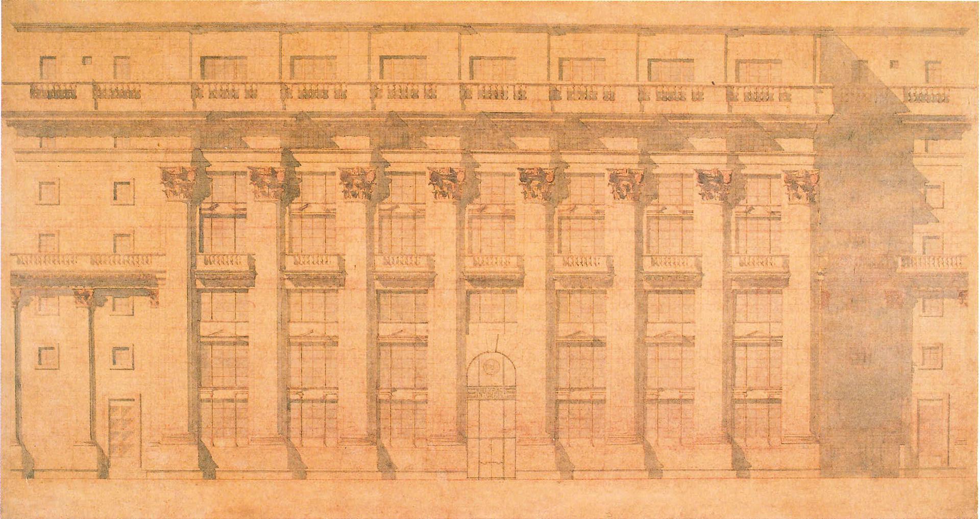 Большой знаток архитектуры эпохи Возрождения и приверженец идей А.Палладио, при проектировании дома И.Жолтовский опирался на его Лоджию дель Капитаньо в Виченце. Тщательно продуманная композиция фасада решена в крупном композитном ордере, расположенном в ризалите здания. Фасад здания отодвинут от красной линии, заглубляя его цокольную часть. В основе конструкции дома — семиэтажный железобетонный каркас с ритмично расположенными широкими оконными проемами. Труднейшую задачу сочетать равномерную сетку семиэтажного жилого дома с членениями прототипа, в котором каждый из трех ярусов принципиально иной, Жолтовскому удалось решить как путем опускания подоконников почти до пола, так и прибегнув к тонированию остекления в местах, где видны были перекрытия.