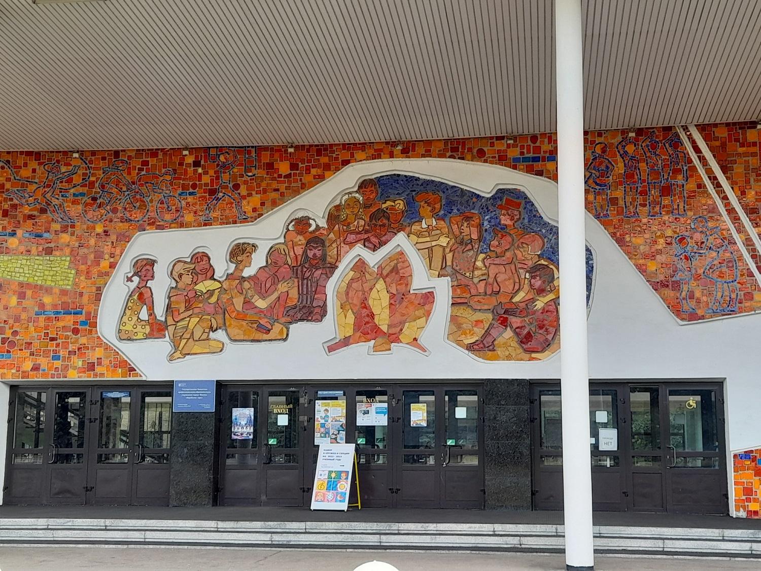 Тесная связь с ландшафтом, открытость, «честность» прозрачной архитектуры, не изолирующей общественные помещения от внешнего мира была дополнена истинно русской спецификой — богатейшим вкладом художников-монументалистов в решение внутреннего и внешнего убранства зданий. Были привлечены десятки молодых авторов — живописцев, мозаичистов, художников по металлу и скульпторов. Глухие торцевые стены получили выразительные панно, стена портика главного входа получила яркое геометризованное оформление. Все внутренние помещения были решены также в сочетании простых форм и мелкой пластики монументального искусства.