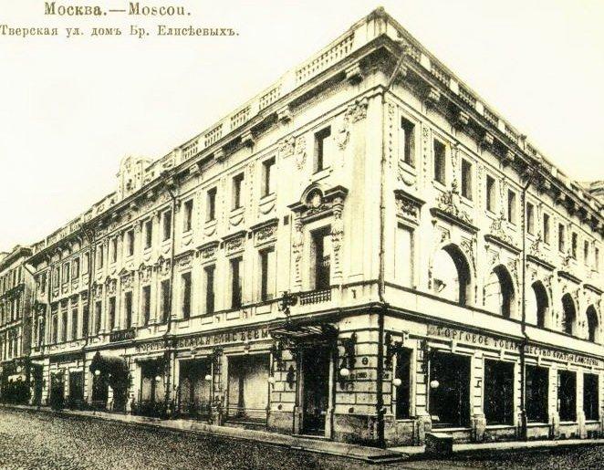 Выходцы из экономических крестьян Ярославской губернии. С 1813 года три поколения Елисеевых превратили фирму «Братья Елисеевы» в одну из самых больших и известных фирм, торгующих продуктами оптом и в розницу в собственных магазинах. При Елисееве на первом этаже был его гастроном из пяти отделов с винным подвалом и пекарней. На втором на какое-то время поселился литературно-художественный кружок, а на третьем располагался коммерческий суд.