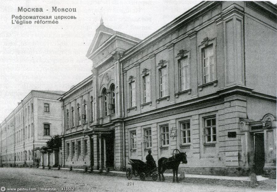 В 1834 году московская община евангелическо-реформатской церкви приобрела в Малом Трехсвятительском переулке участок земли (современное владение № 3) с находившимся на нем каменным жилым домом, построенным в конце XVIII века. Десять лет спустя архитектор В.А. Балашов перестроил здание, приспособив его помещения под ведение богослужений.