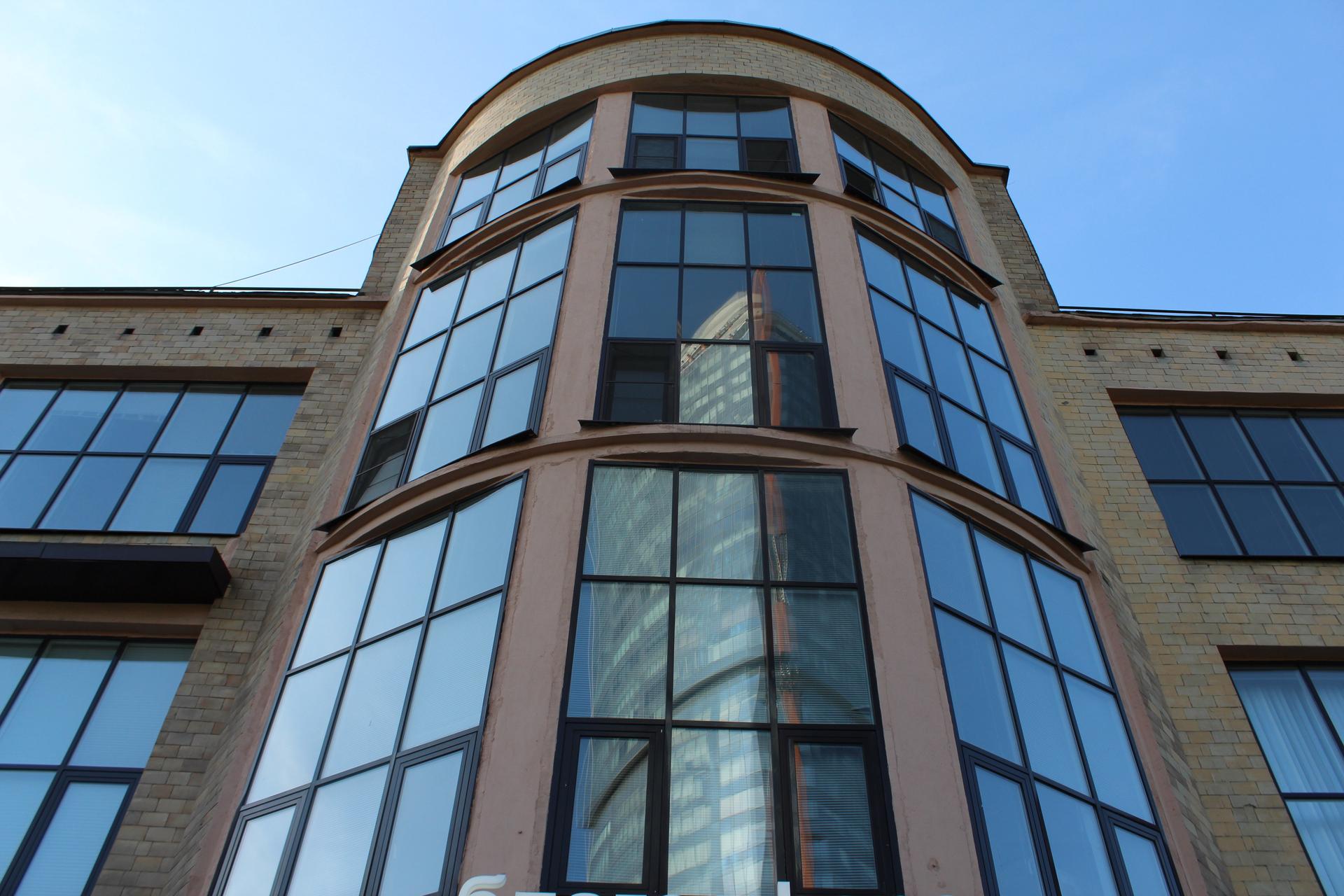 Главный фасад с остекленными полукруглыми эркерами изначально имел лаконичную отделку серой штукатуркой. Во время капитального ремонта в 1960-х гг. он был облицован керамическим кирпичом. В начале 1970-х гг. было полностью заменено и панорамное остекление эркеров, изменившее пропорции оконных проемов и геометрию самих эркеров, ставших трехгранными.