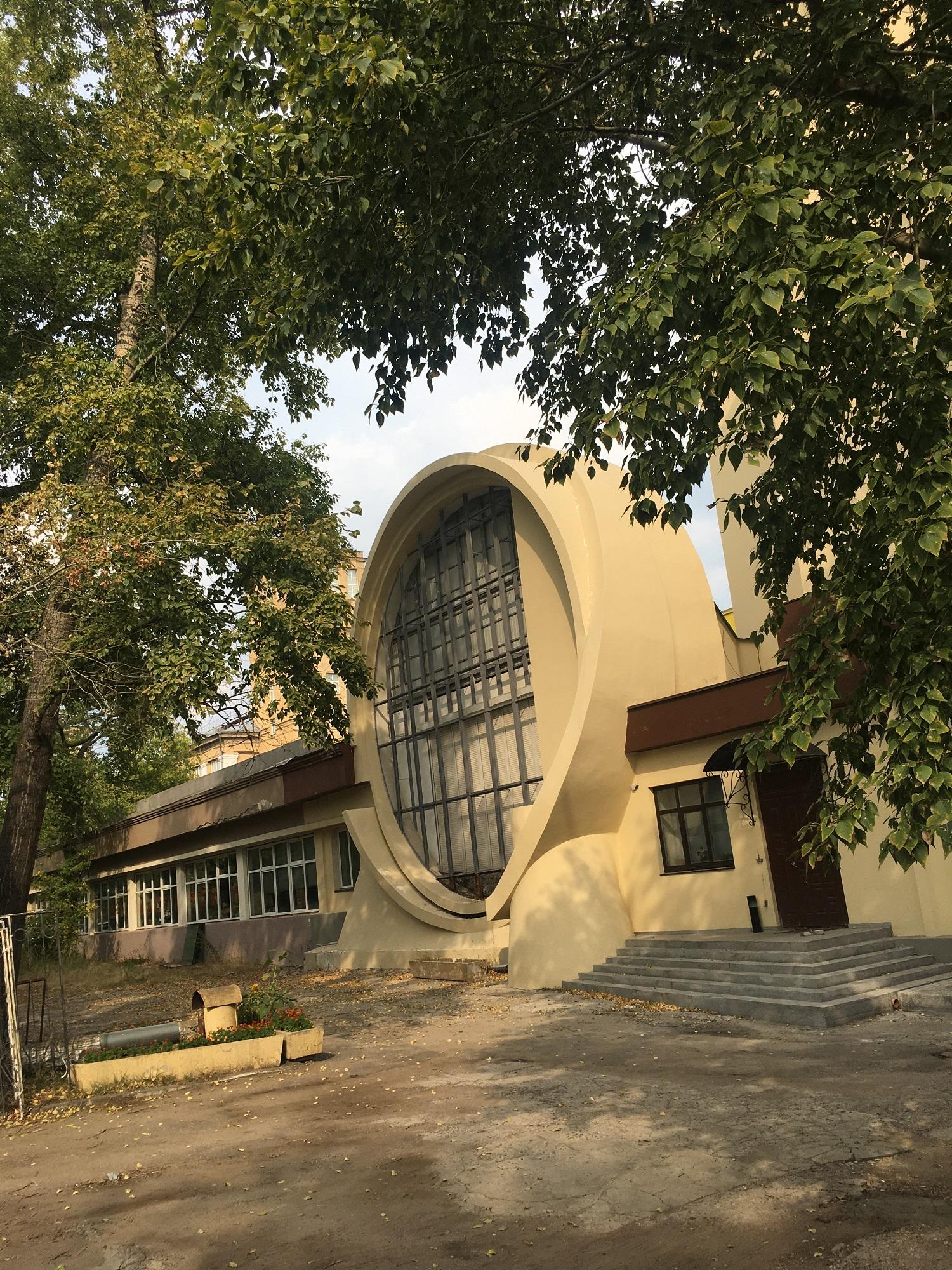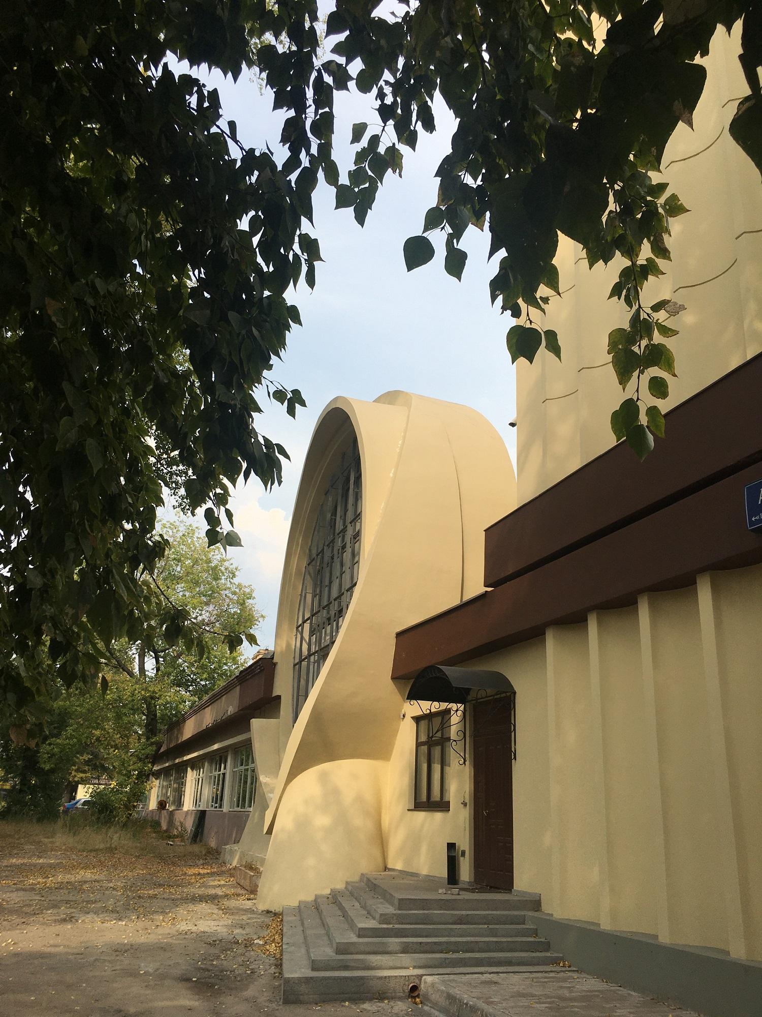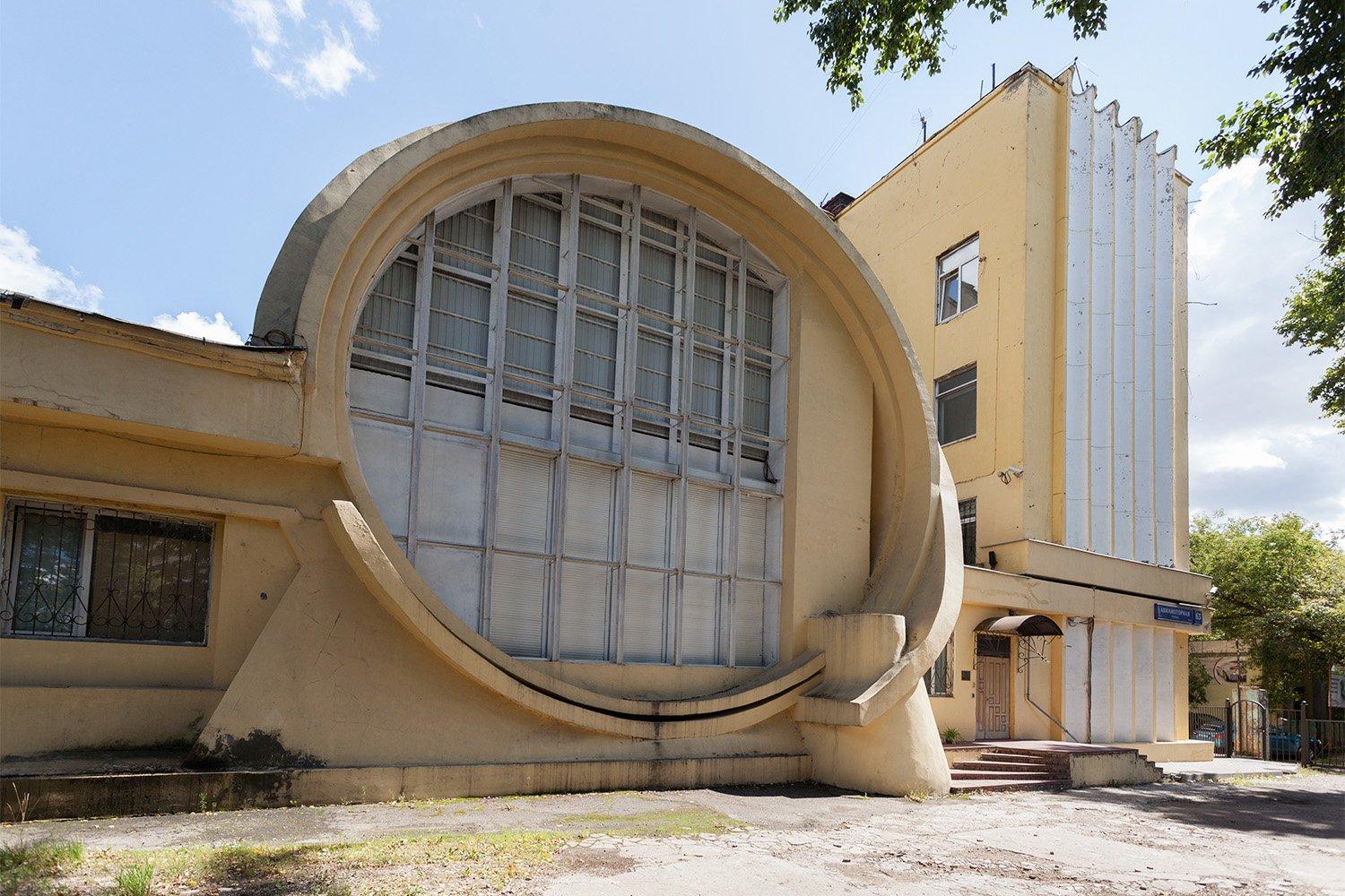 Особенно необычен здесь уличный фасад основного корпуса гаража с размещенной в нем же столовой, для которой было устроено огромное круглое окно с массивным обрамлением.