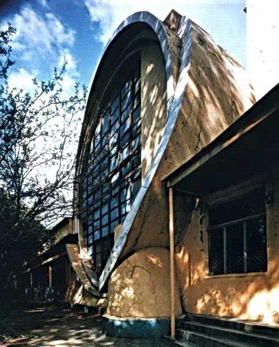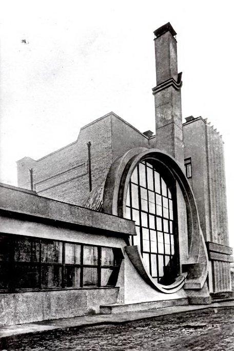 В остальном данный гараж решен просто — прямоугольный каркасный корпус, перекрытый металлическими фермами, но его высокая административная часть поражает своей рифленой поверхностью, она прорезана гипертрофированными каннелюрами античных колонн.