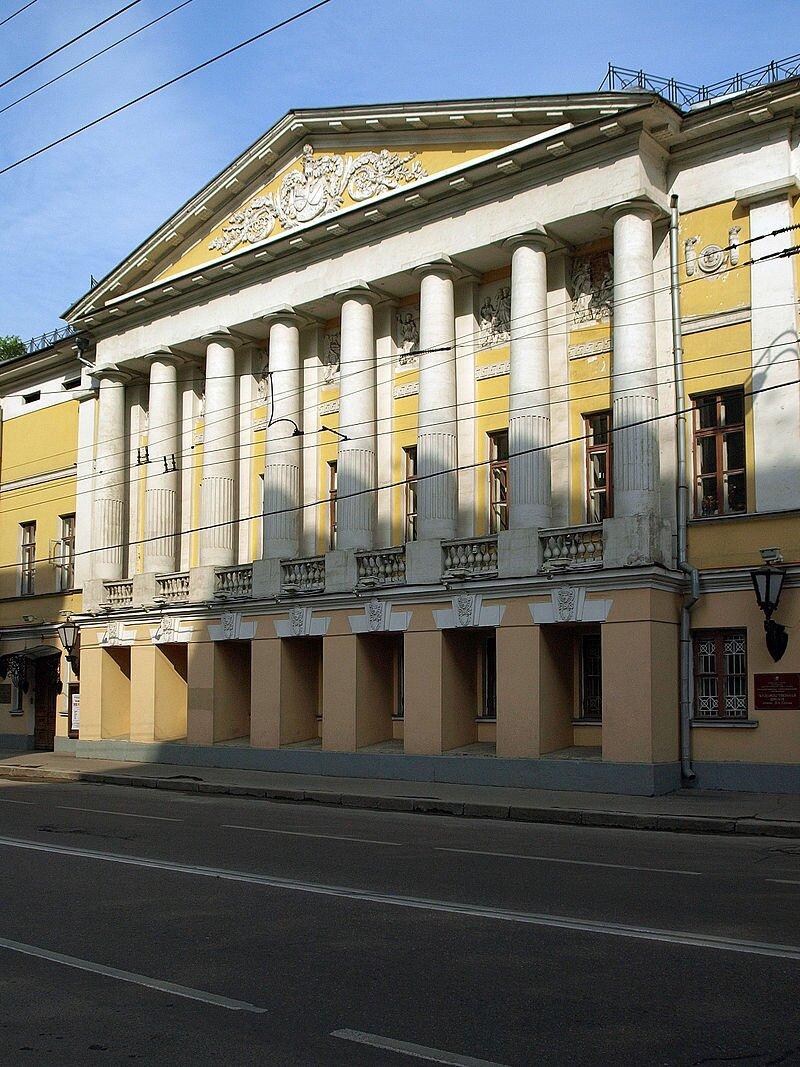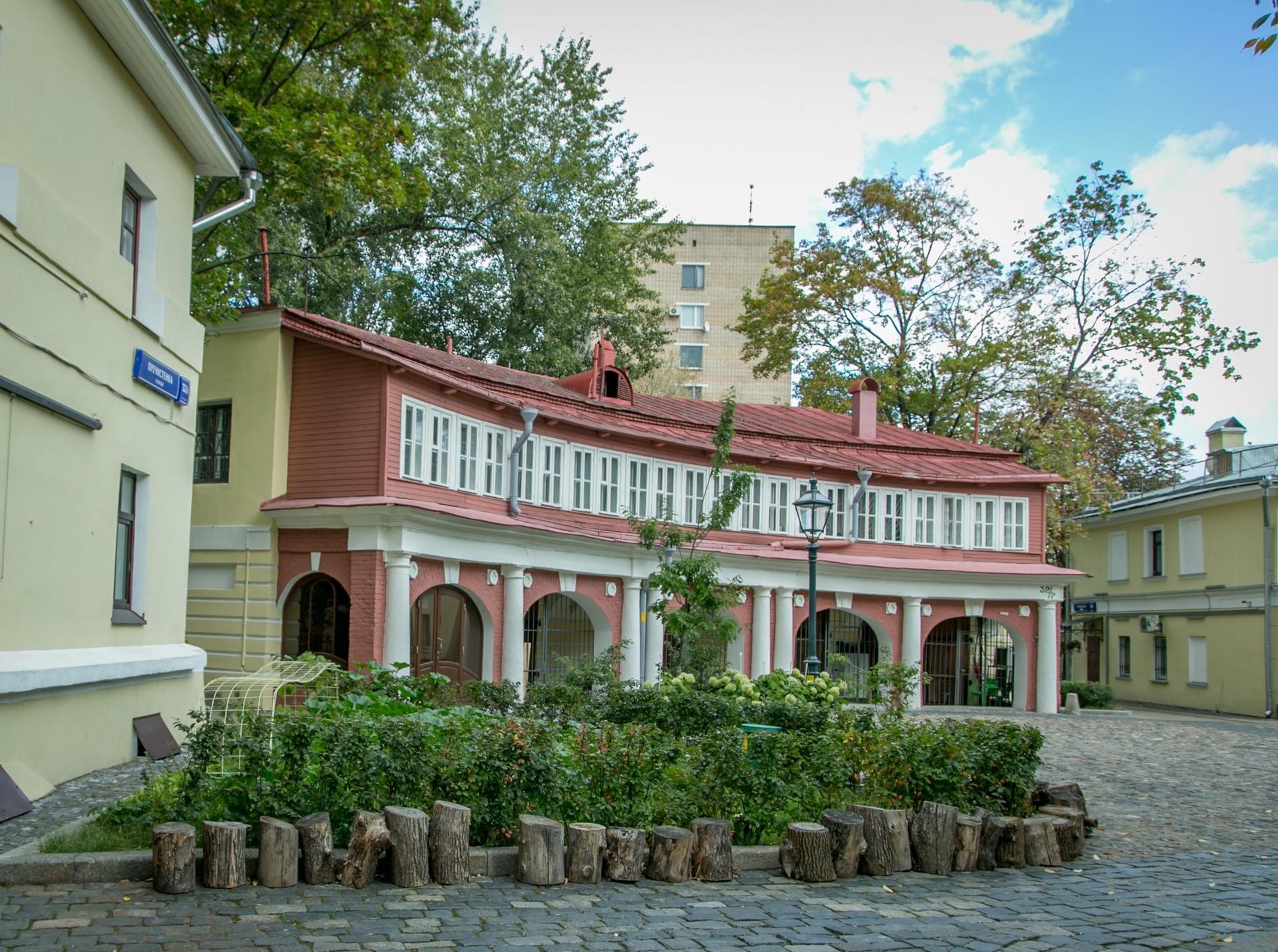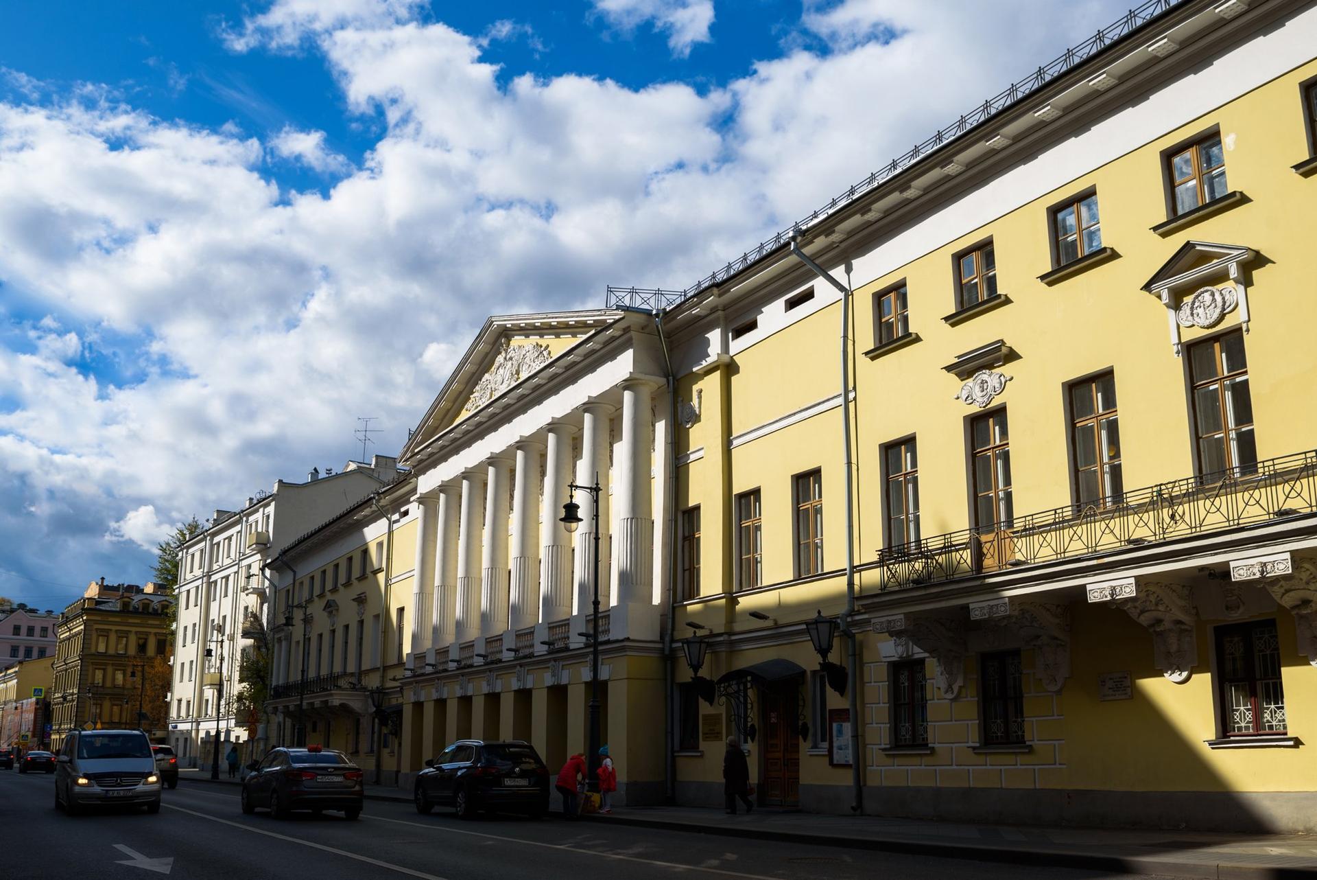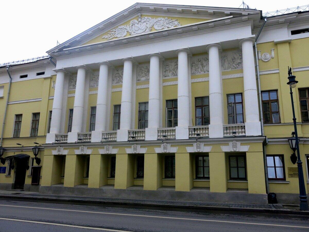 Эта усадьба на Пречистенке была перестроена, а точнее, возведена заново в классическом стиле вскоре после пожара 1812 года, на месте сгоревшей старой усадьбы Талызиных. Вся новая застройка была каменной. Главный Т-образный дом, что стоит по красной линии Пречистенки, строился с 1817 по 1820 год; по некоторым данным, автором проекта является известный архитектор Ф.К. Соколов – один их тех, кто восстанавливал Москву. Усадьба для нового владельца, гвардии корнета Павла Яковлевича Охотникова, получилась величественной, почти дворцом. Уличный фасад главного дома был украшен восьмиколонным портиком, поставленным на цоколе и увенчанным фронтоном с лепниной. Арочные проезды по сторонам дома во двор, флигели, дворцовые службы во внутреннем дворе (конюшни, каретный сарай), домовая церковь… Достаточно сказать, что когда в Малом театре ставили грибоедовскую комедию «Горе от ума», именно интерьеры дома по Пречистенке легли в основу декораций, созданных знаменитым Евгением Лансере.