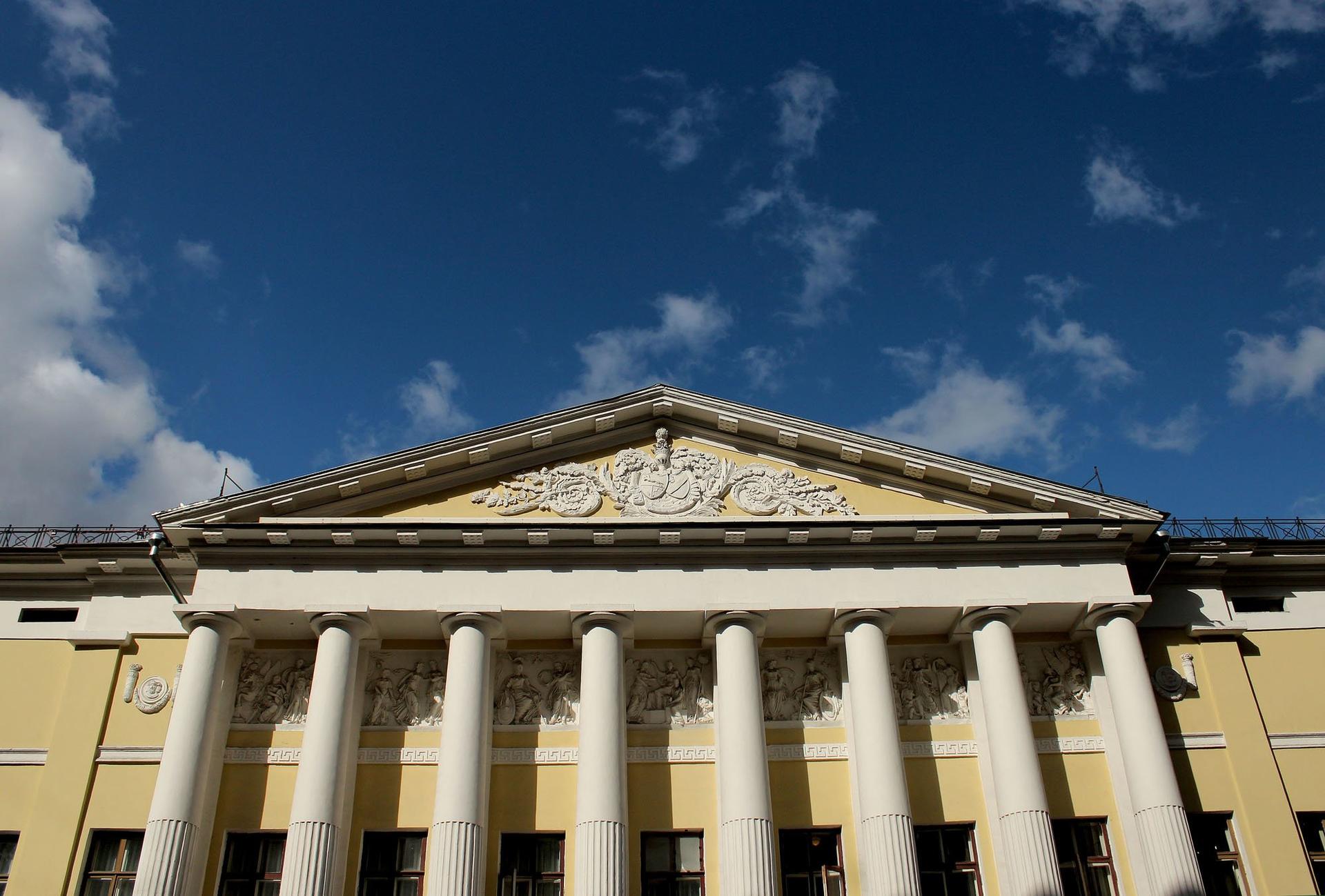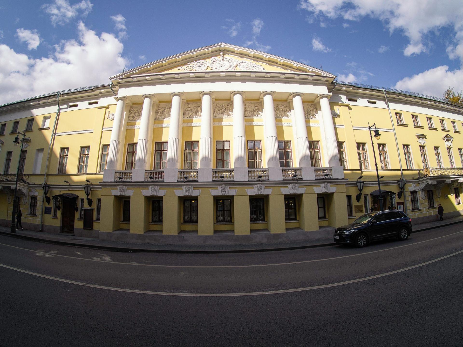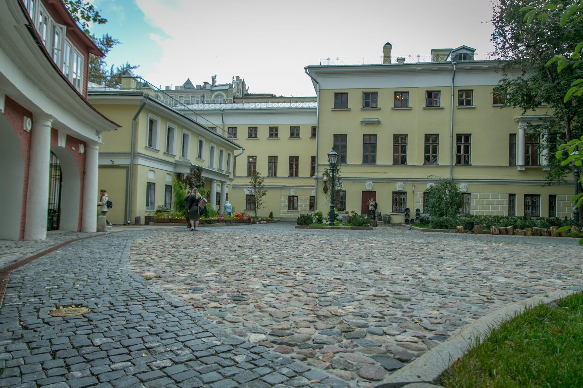 Эта усадьба на Пречистенке была перестроена, а точнее, возведена заново в классическом стиле вскоре после пожара 1812 года, на месте сгоревшей старой усадьбы Талызиных. Вся новая застройка была каменной. Главный Т-образный дом, что стоит по красной линии Пречистенки, строился с 1817 по 1820 год; по некоторым данным, автором проекта является известный архитектор Ф.К. Соколов – один их тех, кто восстанавливал Москву. Усадьба для нового владельца, гвардии корнета Павла Яковлевича Охотникова, получилась величественной, почти дворцом. Уличный фасад главного дома был украшен восьмиколонным портиком, поставленным на цоколе и увенчанным фронтоном с лепниной. Арочные проезды по сторонам дома во двор, флигели, дворцовые службы во внутреннем дворе (конюшни, каретный сарай), домовая церковь… Достаточно сказать, что когда в Малом театре ставили грибоедовскую комедию «Горе от ума», именно интерьеры дома по Пречистенке легли в основу декораций, созданных знаменитым Евгением Лансере.