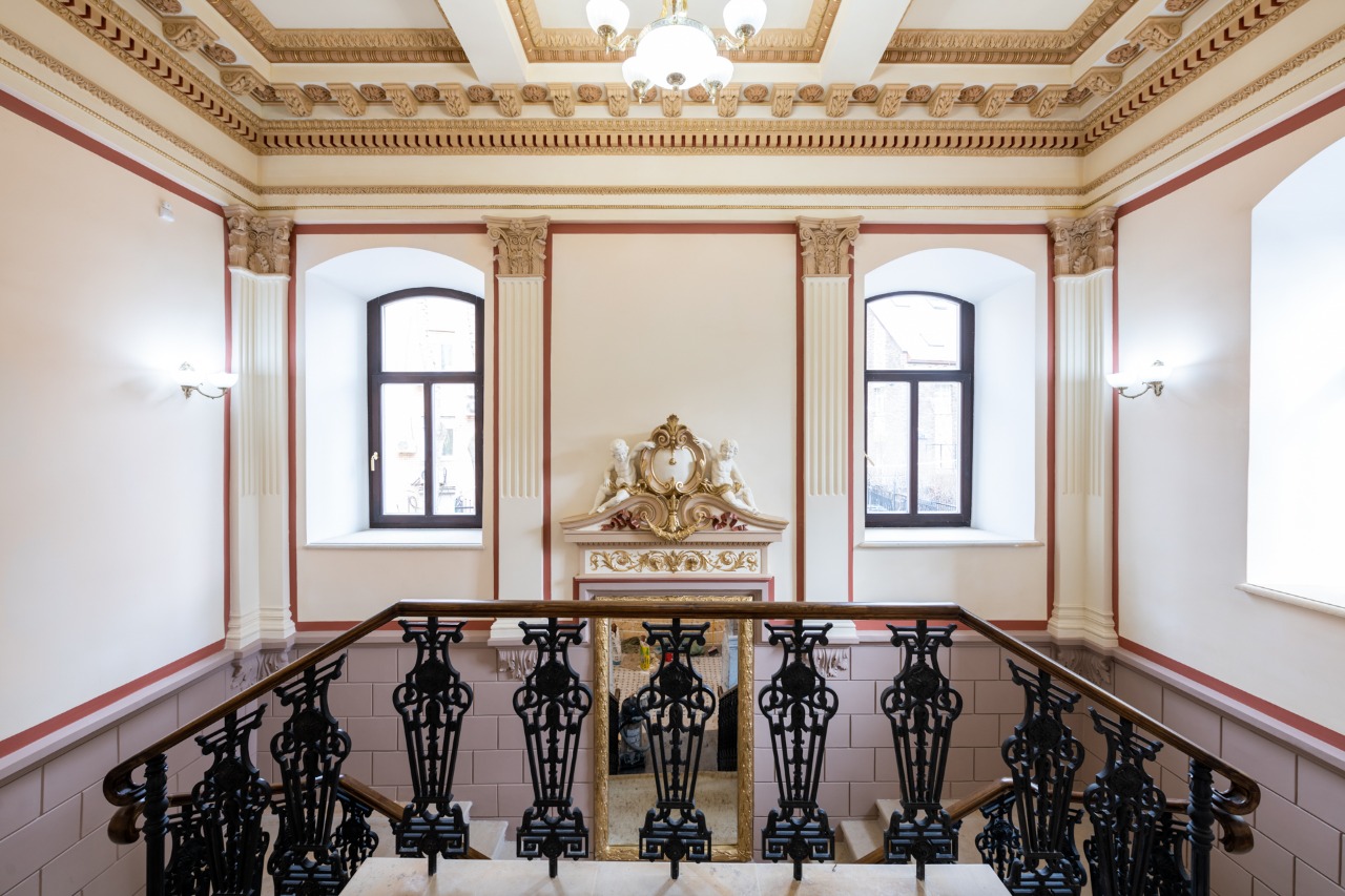В интерьерах демонтировали поздние конструкции, раскрыли исторические проёмы и частично воссоздали первоначальную планировку. Реставраторы обнаружили в подвале подлинную чугунную балясину, что позволило точно воссоздать металлическое ограждение парадной лестницы.