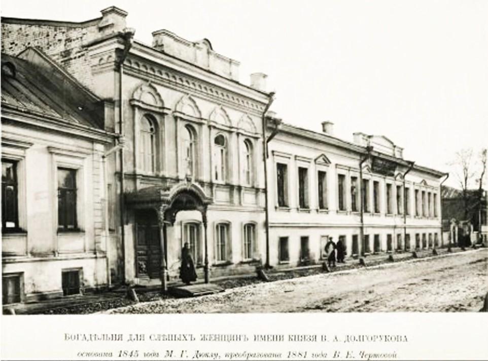 В 1871 г. дом купило Дамское попечительство о бедных. В 1879 г. Варвара Яковлевна Лепешкина устроила в нем церковь Спаса Преображения и богадельню для слепых женщин имени князя Владимира Долгорукова.