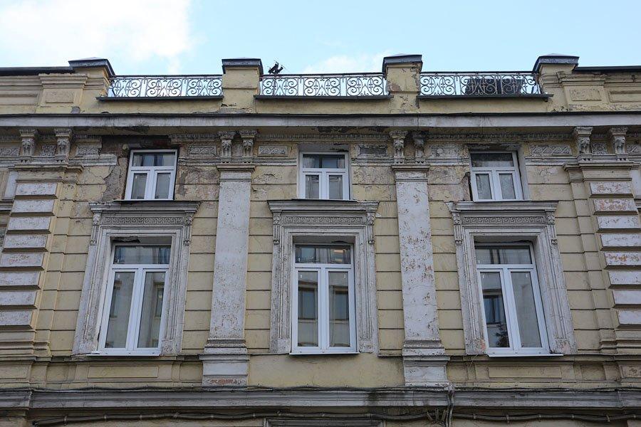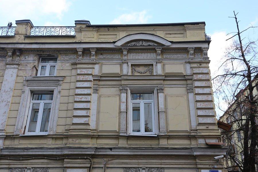 Сегодня со стороны переулка на уровне последнего этажа врезаны маленькие окна-стеклопакеты, что без сомнения нарушило гармоничную картину фасада.