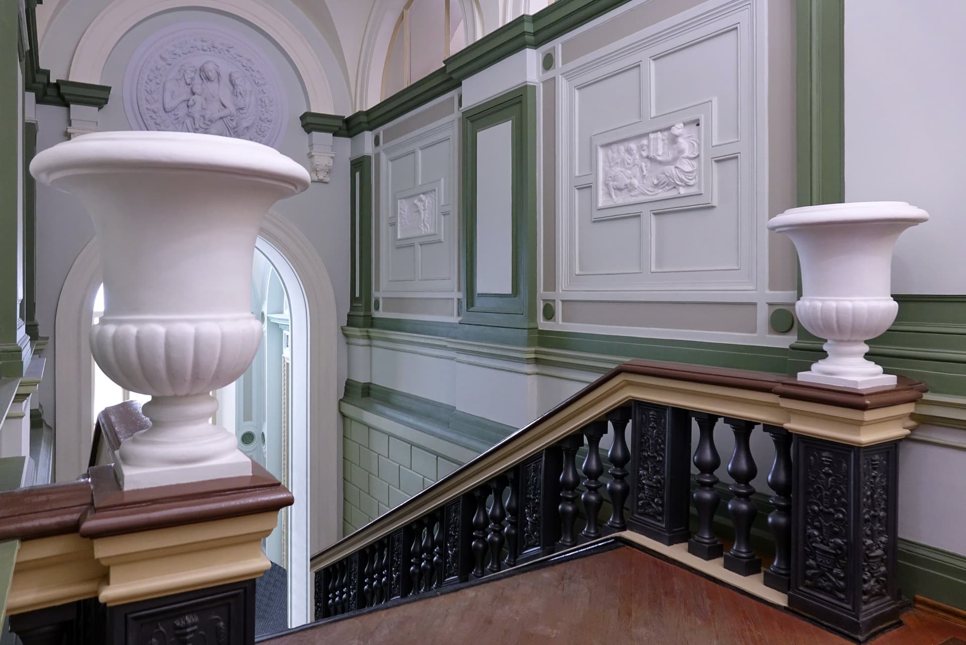 В 1890 году здание на улице Рождественка было передано Строгановскому училищу. К 1892 году под руководством архитектора С.У. Соловьева была проведена следующая реконструкция дома. Парадная лестница была разобрана, вместо нее была сооружена новая чугунная. Двусветный центральный зал был разделен перекрытием. Актовый зал получил новое декоративное оформление. На главном фасаде был разобран классический портик. В новом оформлении были использованы приемы и архитектурные элементы эклектики. Своеобразие главному фасаду придали полихромные керамические вставки.