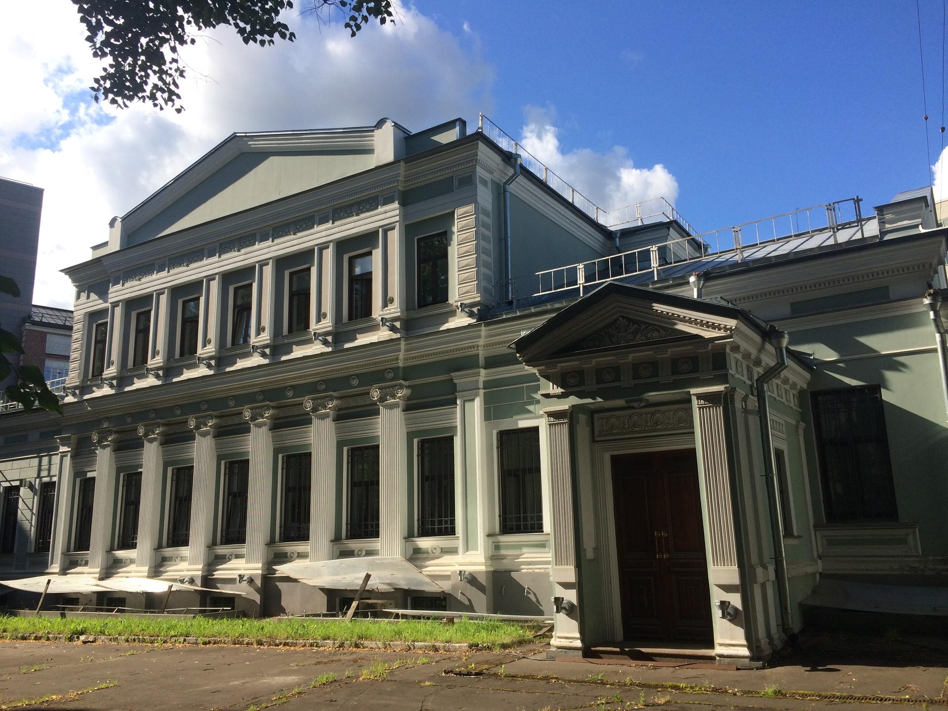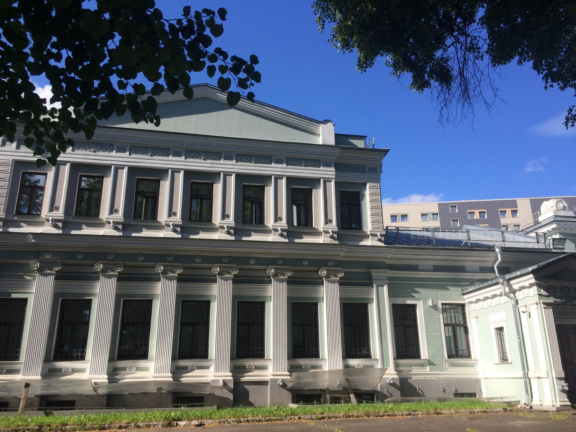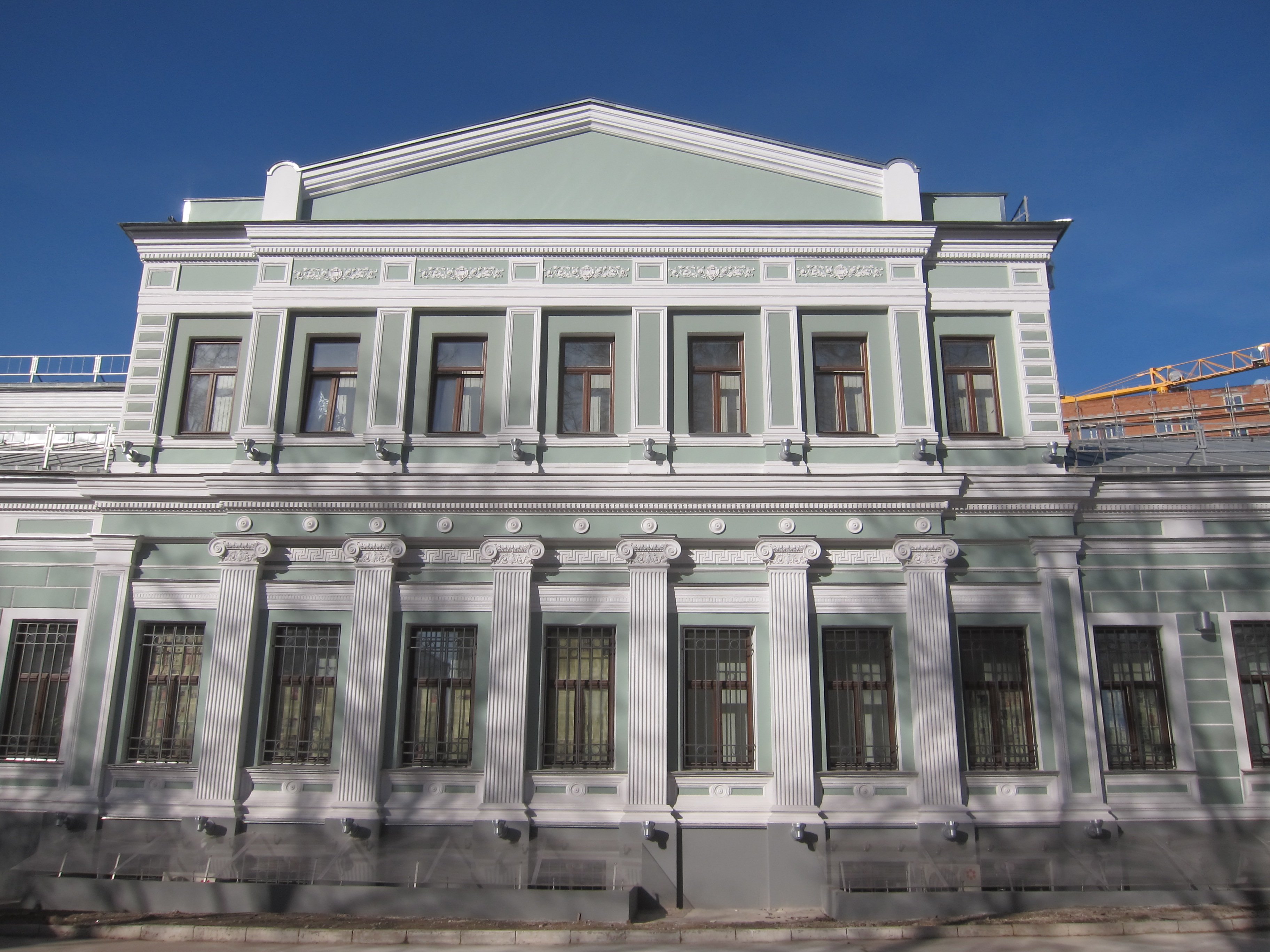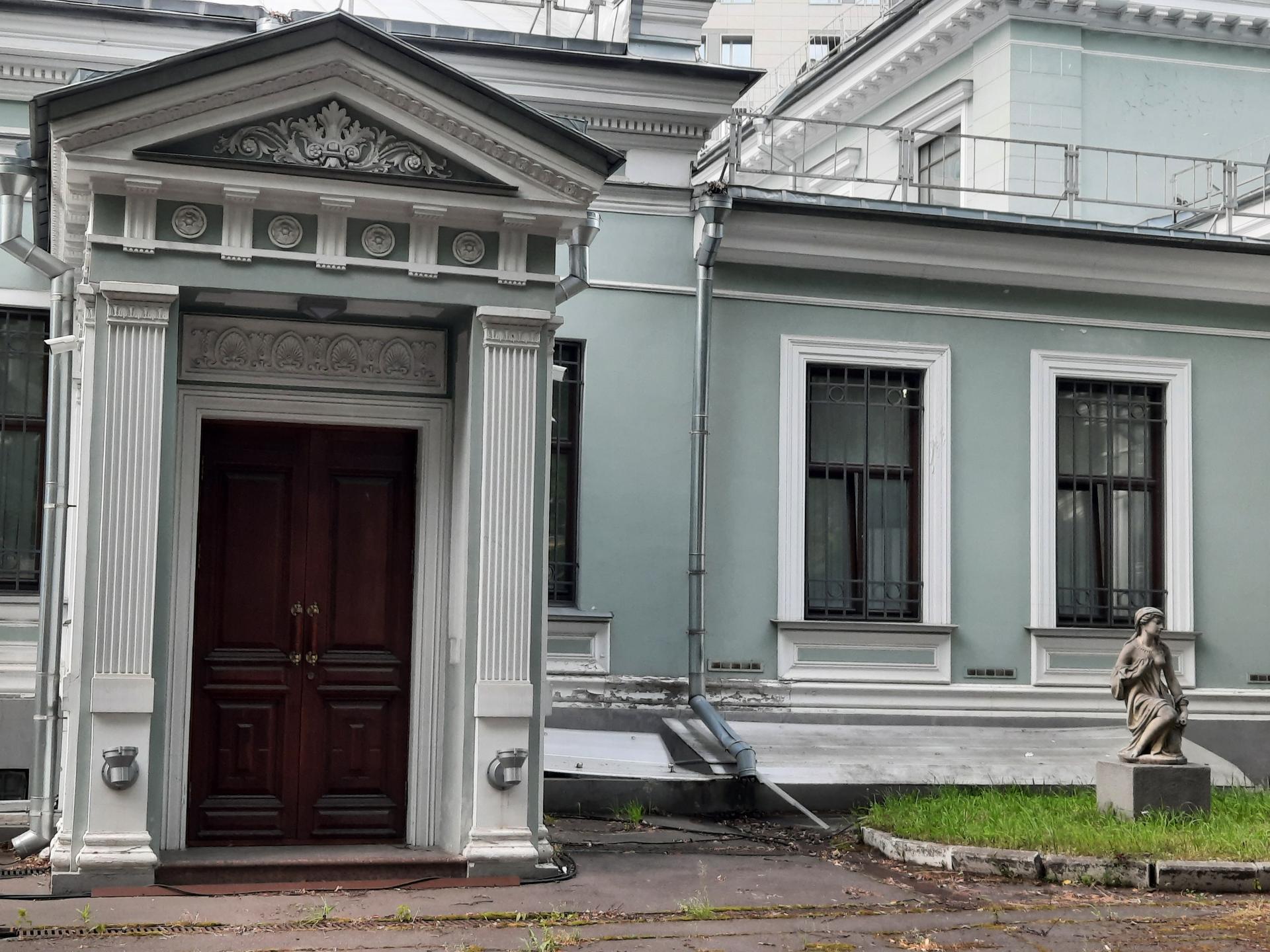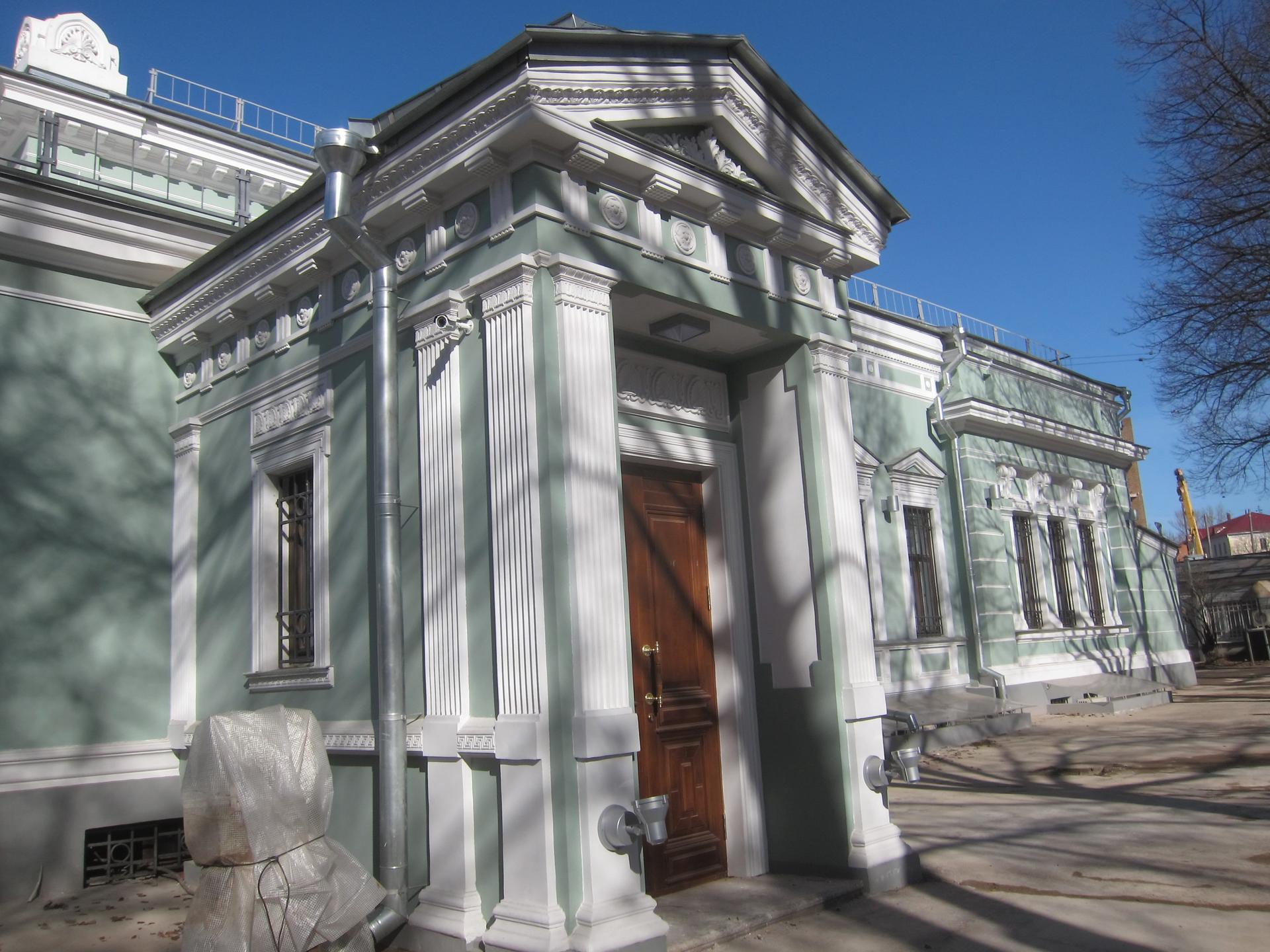Левый входной портик на главном фасаде был полностью демонтирован и восстановлен на новом фундаменте с точным воспроизведением всех архитектурных деталей, включая два оконных проёма, лепной декор и другие элементы. В процессе реставрации восстановили гипсовые элементы архитектурного декора и покрытие на рустованных стенах. Также была отреставрирована штукатурка гладких стен фасада.