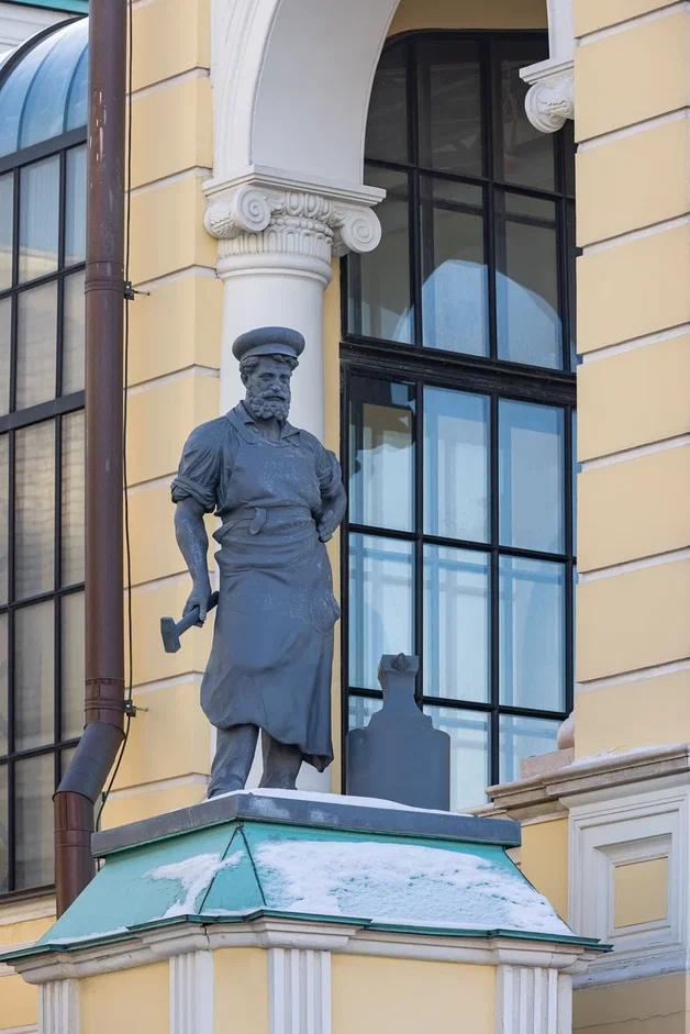 Одним из самых интересных элементов реставрации стало восстановление скульптурной композиции «Литейщик и кузнец», украшавшей пилоны ворот парадного входа. Мастера тщательно отчистили скульптуры, заделали трещины и разошедшиеся швы. Все утраченные элементы были восполнены: для фигуры кузнеца воссоздали молоток и часть наковальни, а литейщику вернули утраченные кисти, ступни и детали одежды.