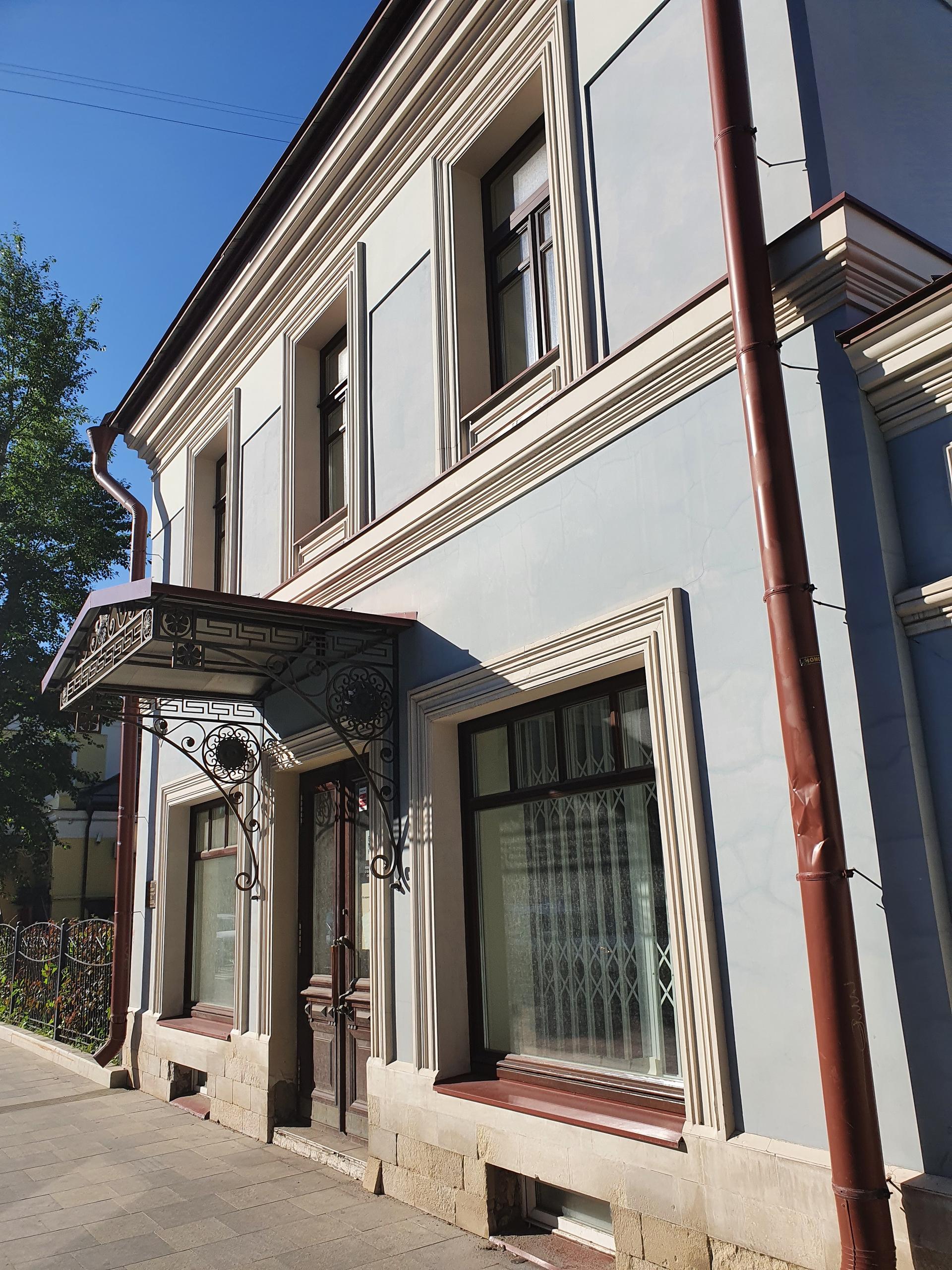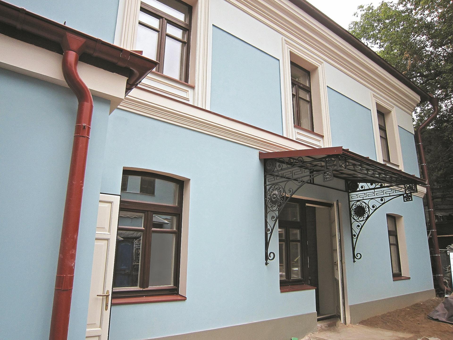 Особое внимание было уделено восстановлению исторического облика фасадов. В центре главного фасада раскрыли историческую дверь, по бокам от входа восстановили широкие витринные окна на основании раскрытых зондажей. В цокольной части устроили узкие оконные проемы в виде продухов. Все декоративные элементы фасадов — карнизы, наличники — были тщательно отреставрированы.