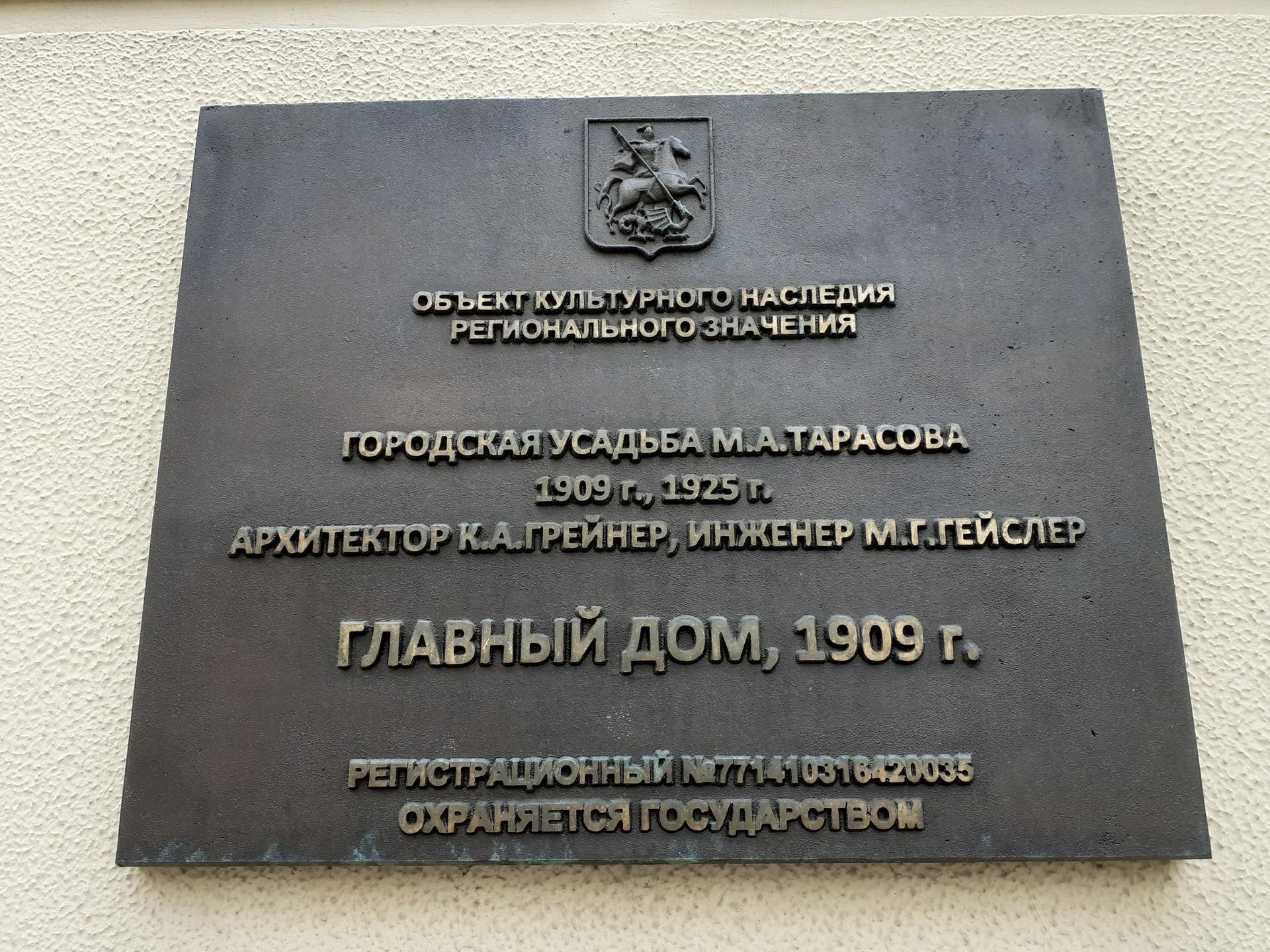 Особняк Михаила Тарасова выполнен в неоклассическом стиле. Фасады двухэтажного, частью трехэтажного, с подвалом и антресолями кирпичного главного дома городской усадьбы сохранили декоративную отделку с многочисленными стильными деталями - вазоны, размещенные в эдикулах, гирлянды, как будто перенесеннные сюда с рисунков художника Сомова, маскароны, лепные фризы ампирного стиля под карнизом.