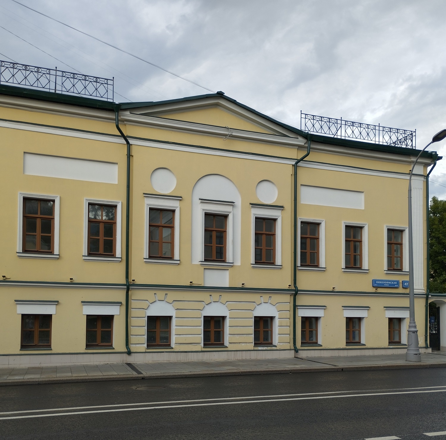 Два больших владения на правой стороне Шелапутинского переулка у пересечения его с Николоямской улицей были приобретены средним сыном Абрамом Саввичем Морозовым. Главный дом владения № 47 выстроен в конце XVIII века. В 1842 году Абрам Саввич перестраивает главный дом для своей семьи. Фасад по улице имеет небольшой фронтончик. Три окна парадной залы украшают небольшие наличники. Со стороны двора дом был трехэатжный за счет жилых антресолей. Окна жилых помещений намного меньше парадных. После смерти Абрама Саввича дом унаследовал его сын Давид Абрамович. Он был совладельцем Тверской мануфактуры. Женат на дочери Павла Петровича Сорокоумовского Елизавете. В этом доме выросли их дети – сын и три дочери. Супруги были большими благотворителями. Создали в помещениях бывшей семейной фабрики богадельню им. Морозовых. В ее финансировании принимала участие вся большая семья.