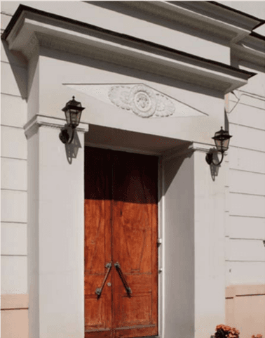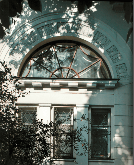 Над ризалитом – декоративным чуть выступающим элементом фасада - высится башнеподобный объём параллелепипеда второго этажа с тремя полуциркульными окнами, более низкими и узкими, чем окна первого этажа. Заканчивается правая часть главного фасада объёмом, завершаемым, в отличие от всех расположенных левее, — двускатной крышей. Она венчает красивую композицию с огромным полуциркульным окном в поле фронтона и лежачим окном, образованным из трёх высоких и узких окон. Величавую красоту этой части фасада подчёркивает пояс барельефов вокруг полуциркульного окна. Большие окна, фактически складывающиеся в единое огромное сплошное окно, с трёх сторон огибают стены зимнего сада. Узкие простенки между окнами разделены приставными полуколоннами, также не имеющими ни баз, ни капителей.