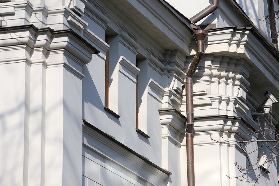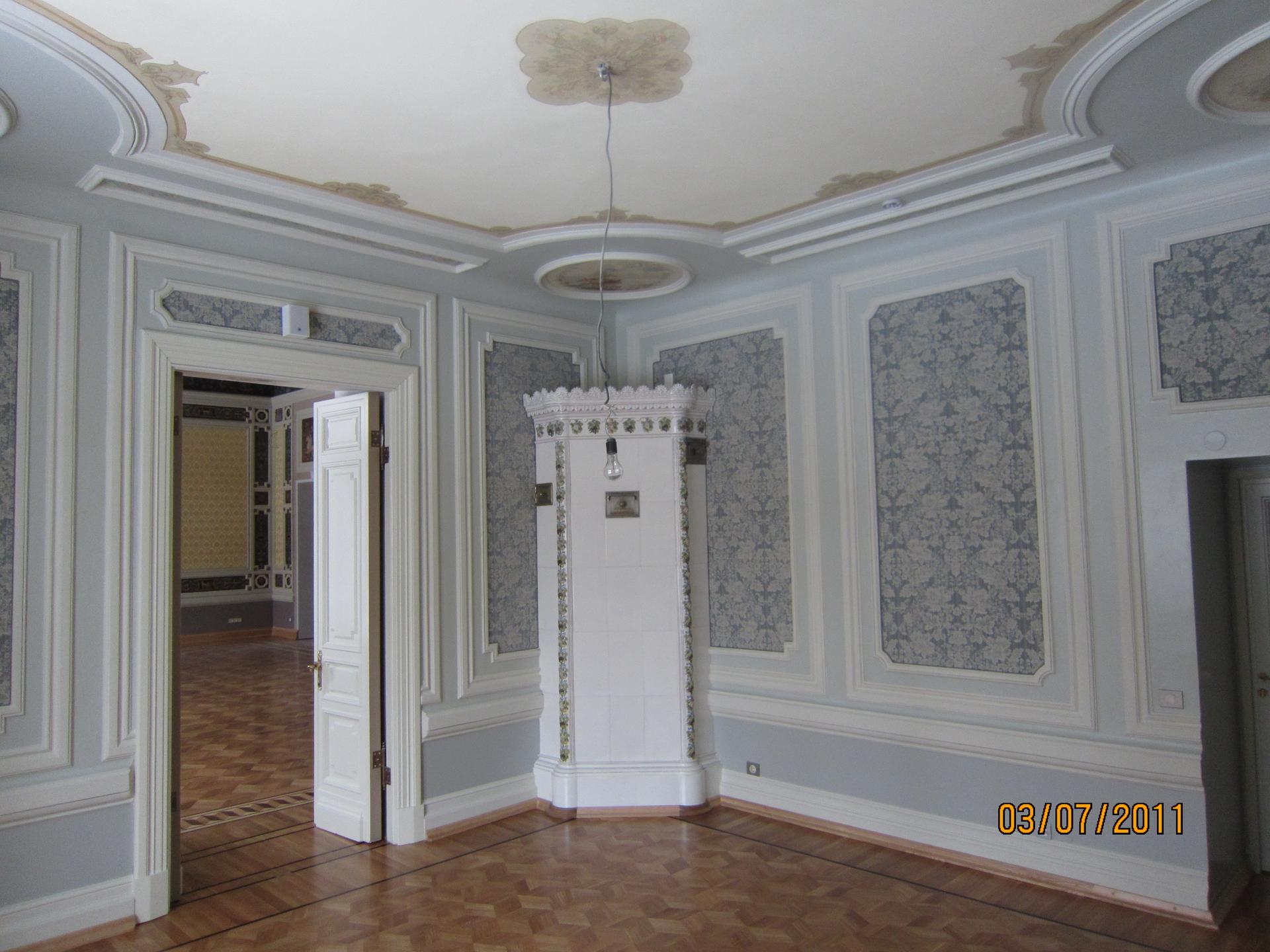 В будуаре была заменена часть лепных профилей, пострадавших от протечек и естественного старения, а также удалена старая покраска стен и декора.
