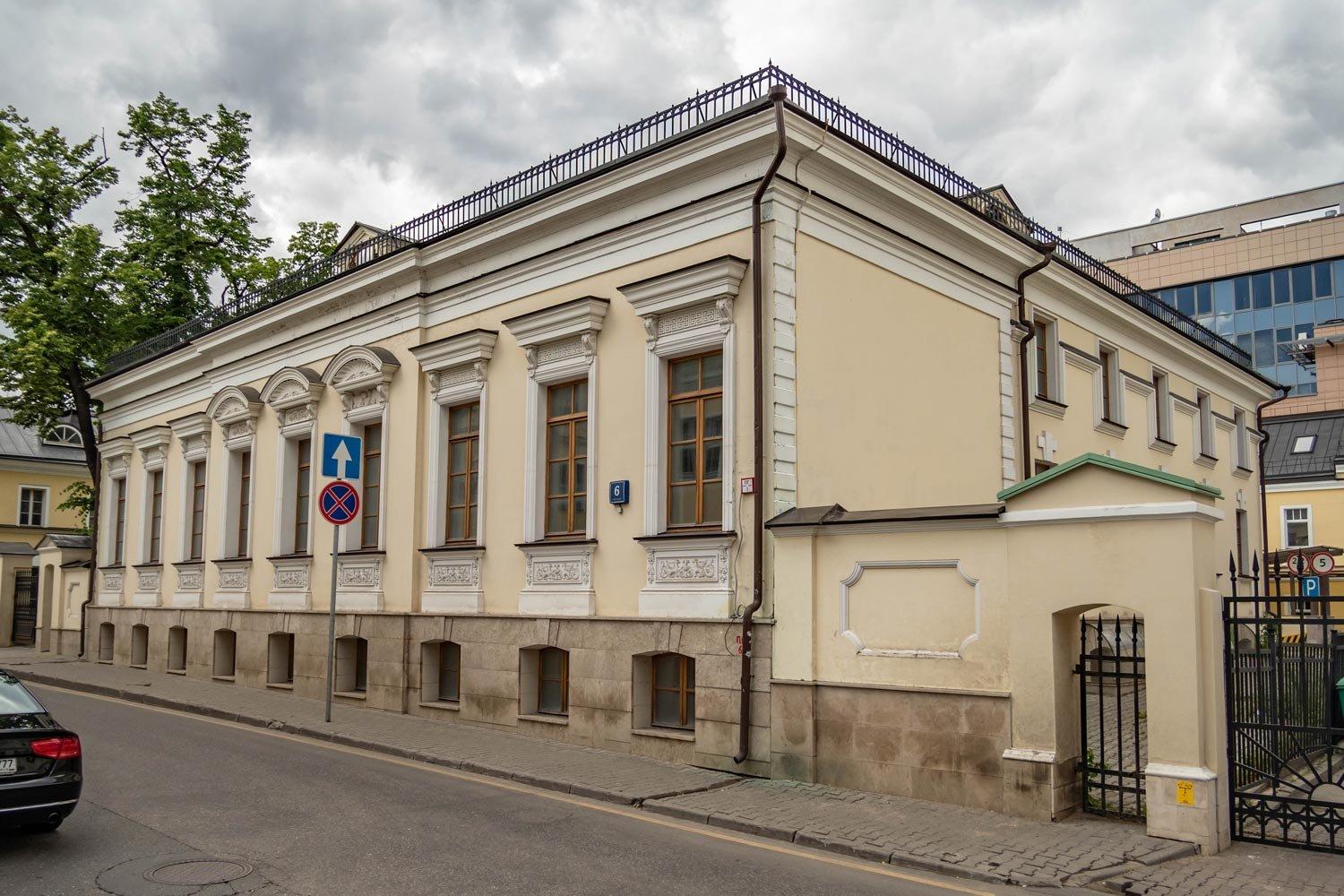 В наши дни строения бывшей городской усадьбы в 1-м Казачьем переулке были отреставрированы. Наибольший интерес представляет главный дом – характерный для послепожарного времени прямоугольный в плане деревянный особняк на каменном подвале с антресолями. Парадный фасад здания имеет ярко выраженные вертикальные членения. В центре расположен ризалит в три окна, завершенный парапетом сложной формы. Окна украшены наличниками с сандриками на валютообразных кронштейнах. Подоконные филенки заполнены плоскими горельефами с изображениями грифонов, пальметт, меандра и сложного растительного орнамента. Окна ризалита выделены лучковыми фронтонами. Левый флигель усадьбы имеет более скромную декорацию: простой карниз, подоконная тяга второго этажа и небольшие ниши под окнами первого.