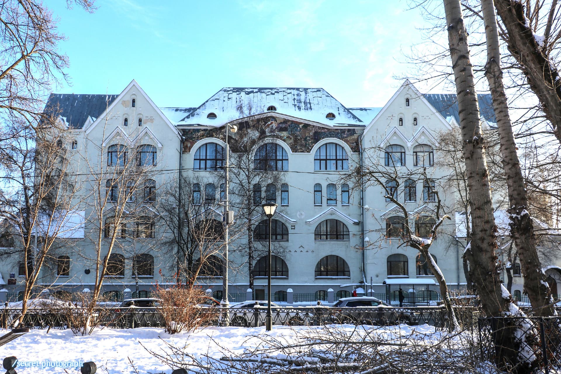 В архитектурно-художественном оформлении дома органично сочетаются стили модерн и неорусский. Его главный фасад выполнен симметрично, придавая длинному четырехэтажному строению величественный вид. Перекрытиями являются крестовые своды и своды «Монье». Двускатная крыша отличается значительной высотой, а фронтон переходит в скат, напоминая крыши древнерусских теремов. В конструкции использованы полукруглые окна с многоцентровыми перемычками, размер которых варьируется от небольших узких проемов, похожих на лазейки, до больших полукруглых окон. Профилированные карнизы над окнами украшают такие лепные элементы, как сандрики, бегунец, ниши, солярные символы. Карнизы, настенные украшения, орнаментальные пояса и лепные детали выполнены в традициях новгородского и псковского храмового декора XII-XV веков.