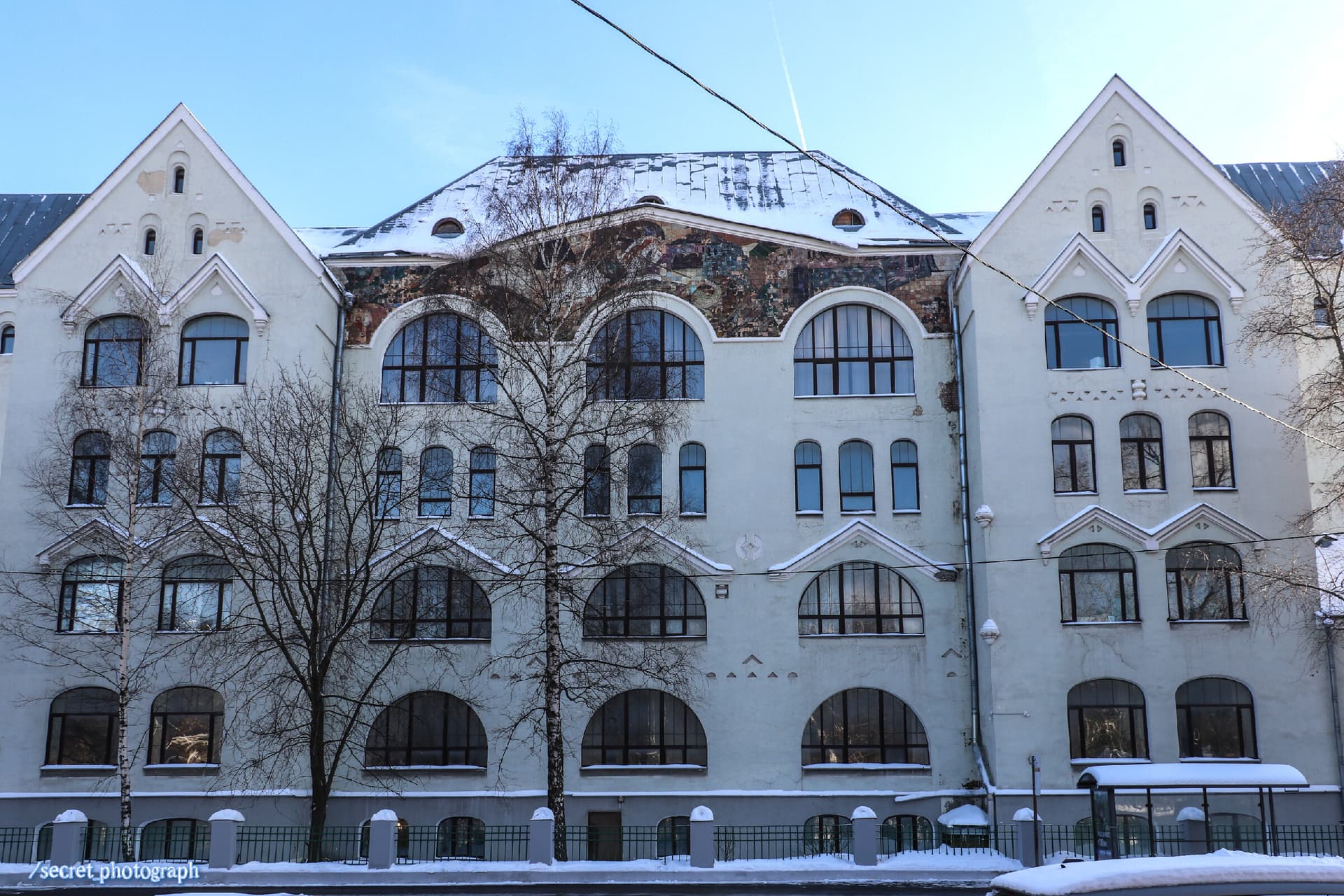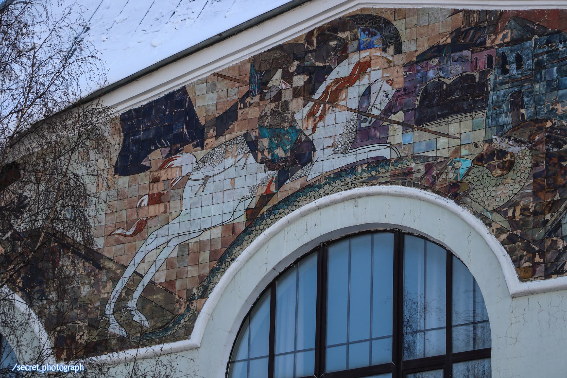 На фронтоне главного фасада привлекает внимание большое яркое панно из майолики, повествующее об эпическом сражении Святого Георгия со Змием. Это изысканное панно было изготовлено на Абрамцевской фабрике и на фабрике Гельдвейна-Ваулина в Кикерино, под г. Санкт-Петербургом. Панно было создано по эскизам выдающихся художников Сергея Васильевича Герасимова и Сергея Васильевича Чехонина (участие С.В. Чехонина в создании этой майолики является предметом споров специалистов).
