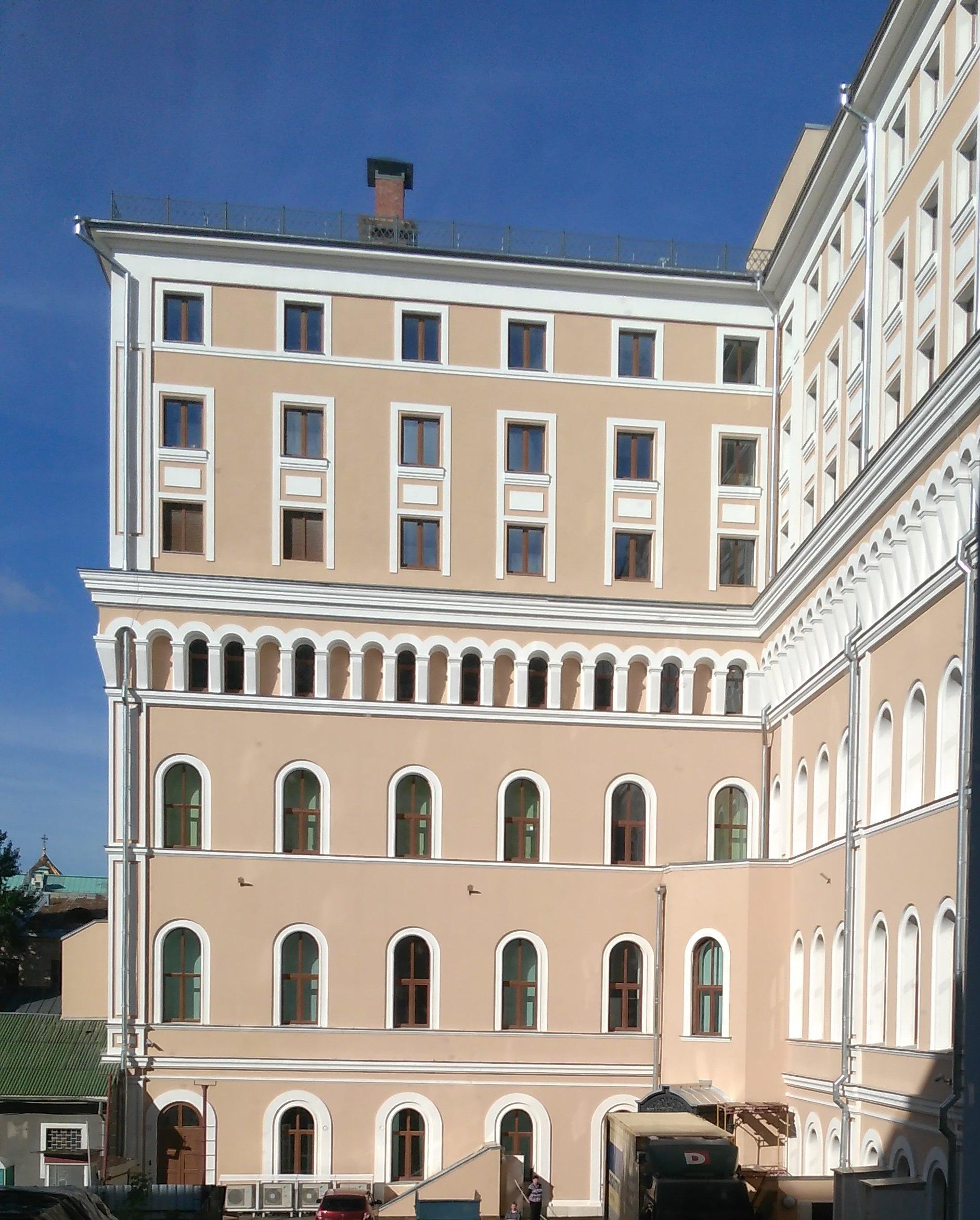 Проект был поручен петербургскому архитектору Ивану Чернику, а строительством руководил Антон Васильевич Булгарин (Васильев). Разрешение на постройку четырехэтажного подворья было получено в июне 1860 года, и через четыре года строительство было завершено.