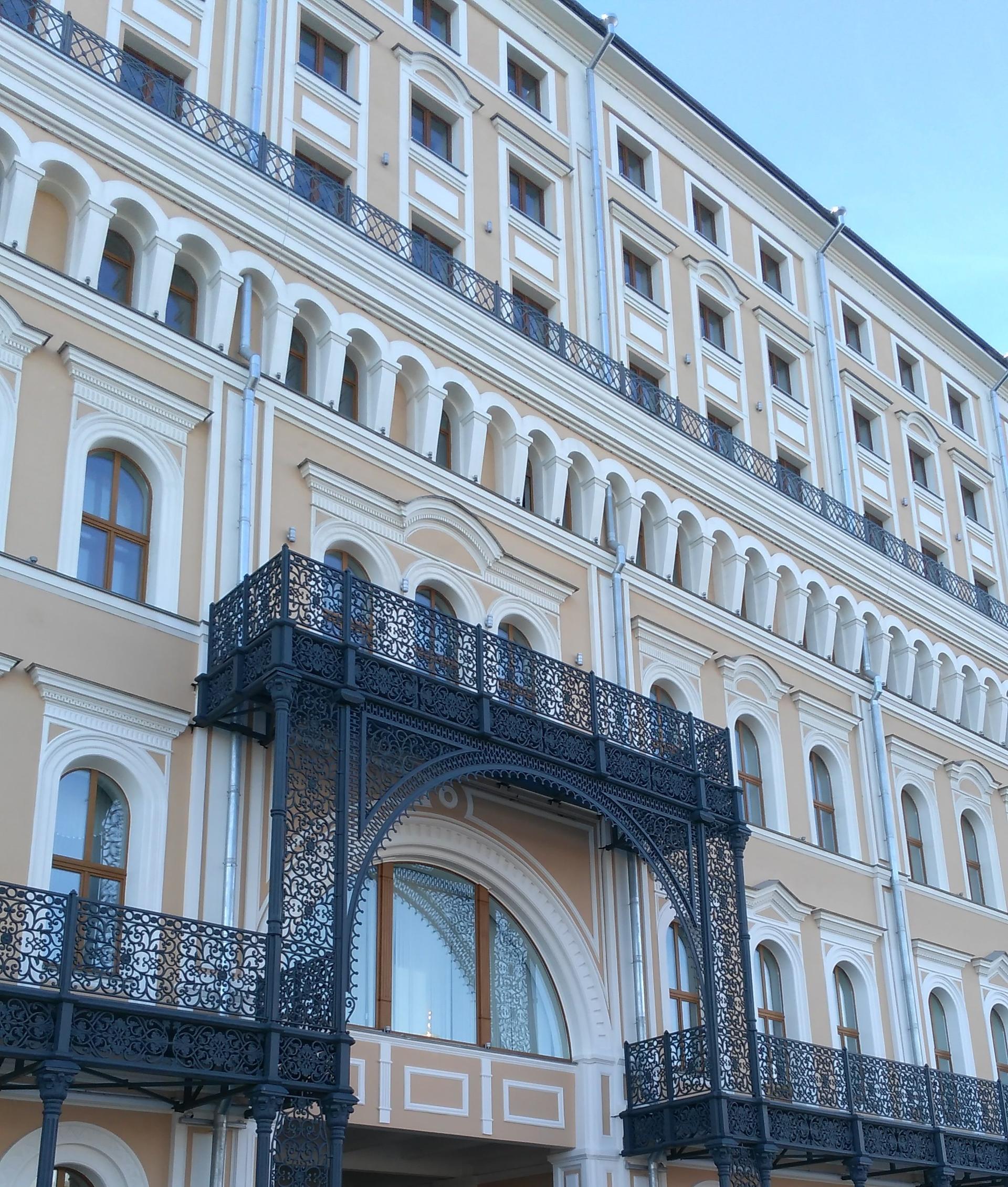 Значительный объем работ был произведен по реставрации фасада. Особое внимание было уделено воссозданию утраченной чугунной галереи и карниза из машикулей – стилизованных навесных бойниц, которые являлись характерной особенностью здания. Эти элементы были восстановлены по сохранившимся образцам, архивным фотографиям и историческим аналогам.