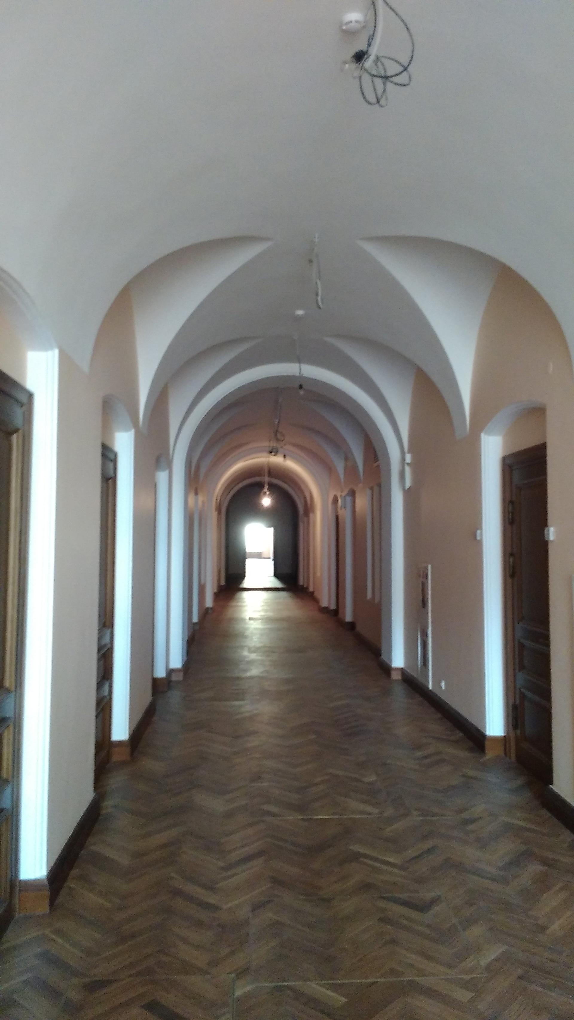 Внутри здания были проведены работы по восстановлению элементов планировки, включая сводчатые коридоры, и декоративной отделки интерьеров. Мастера отреставрировали исторические своды первых этажей, расчистили и восстановили лепной декор на сводах и стенах. Были обнаружены и отреставрированы 16 каминов и встроенных сейфов «под камин».