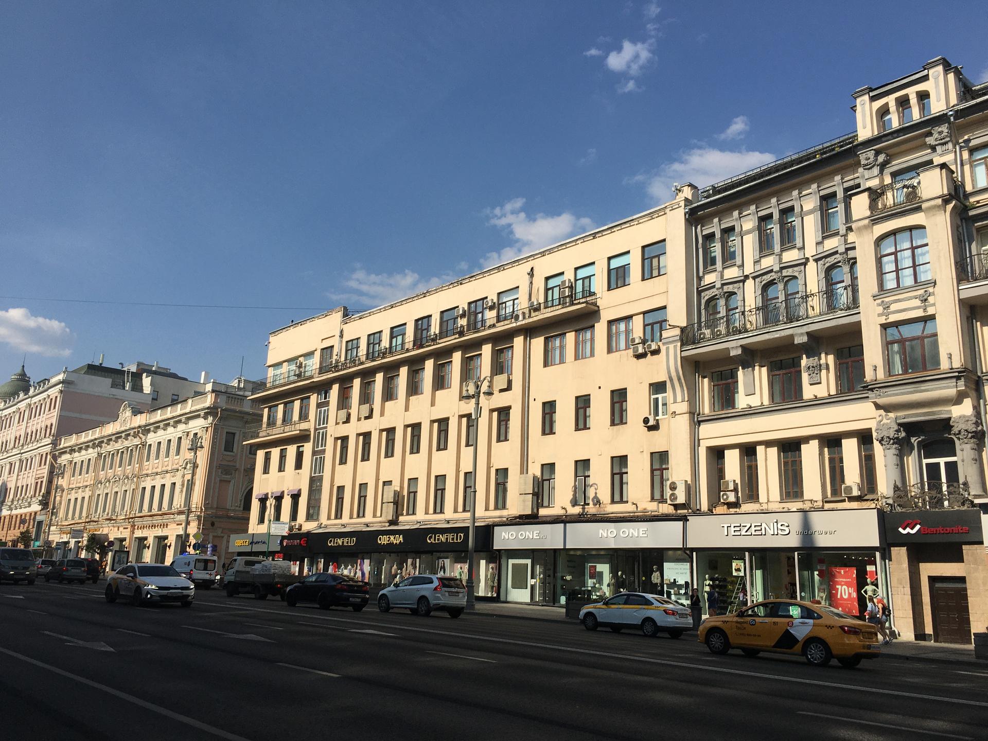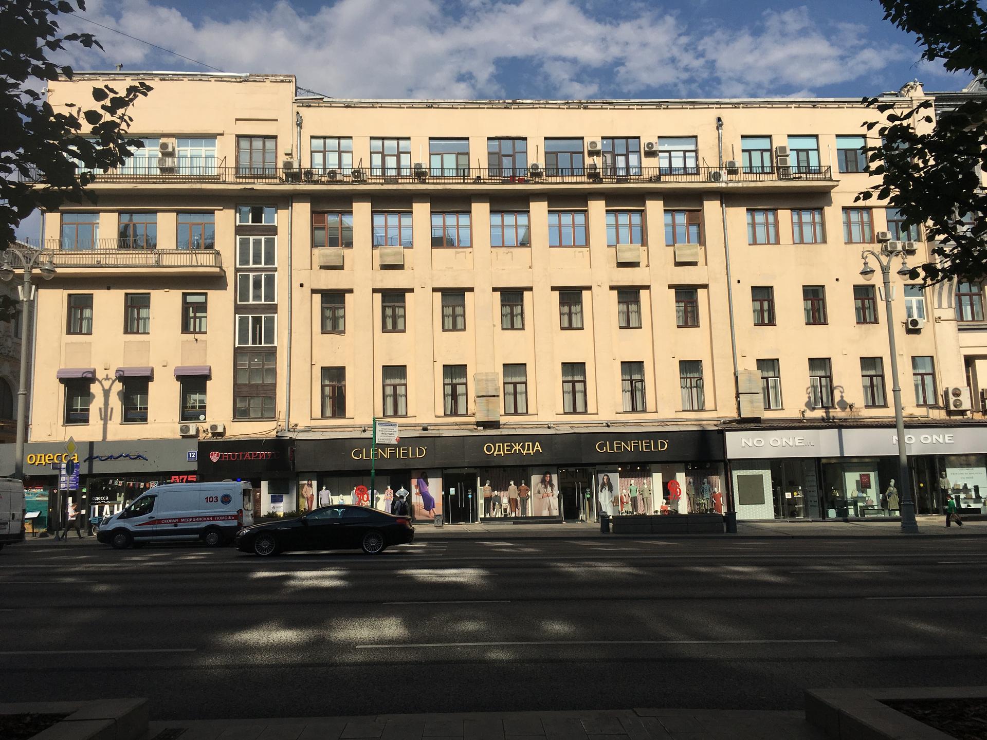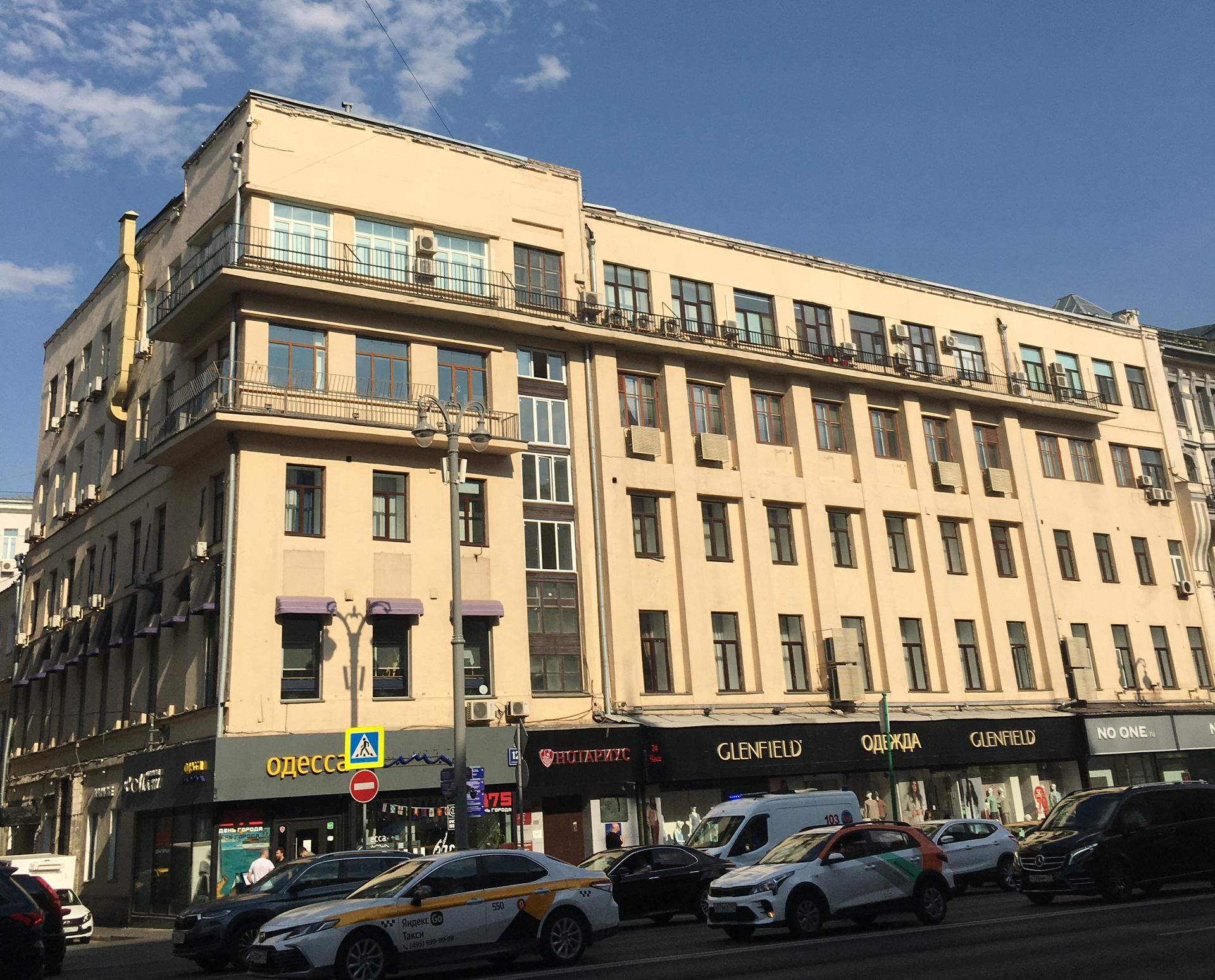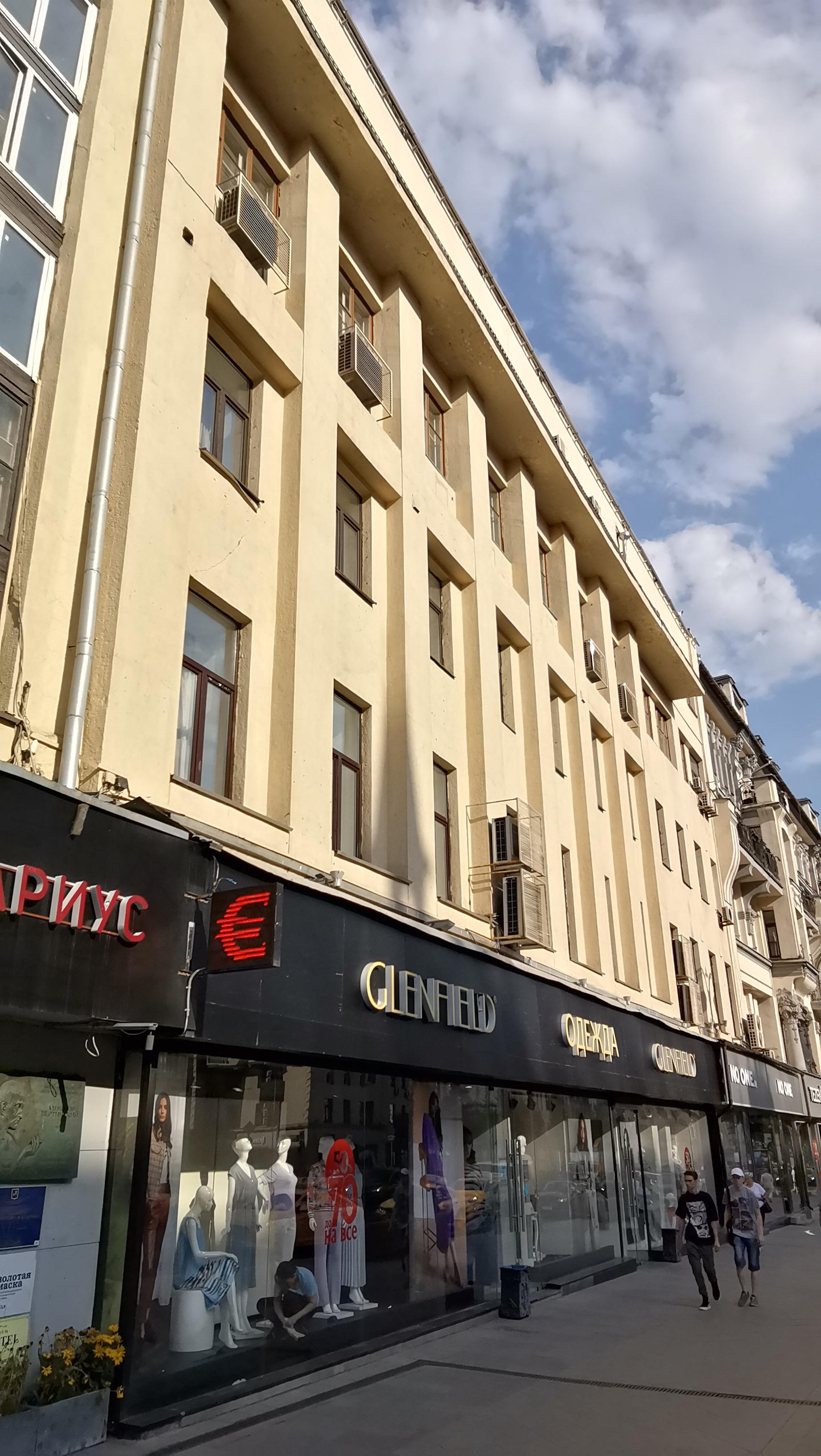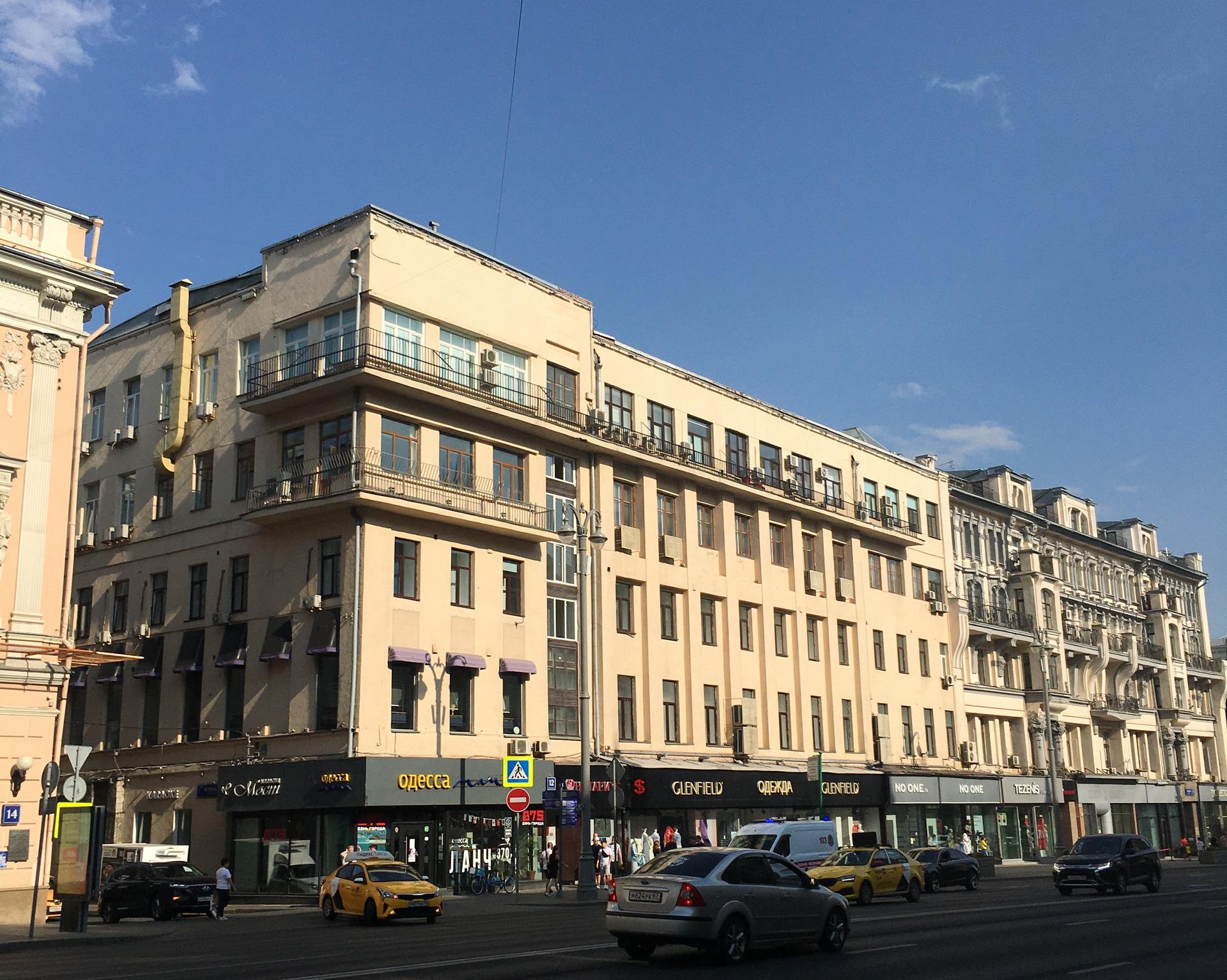 Здесь должны были размещаться квартиры сотрудников «Центропечати», а также конторы и магазины. В советское время здесь был магазин «Гастроном», сейчас его место заняли дорогие бутики и кафе. Наверное, они располагаются как раз в том месте, где у Шевалдышева было фойе его великолепной гостиницы.