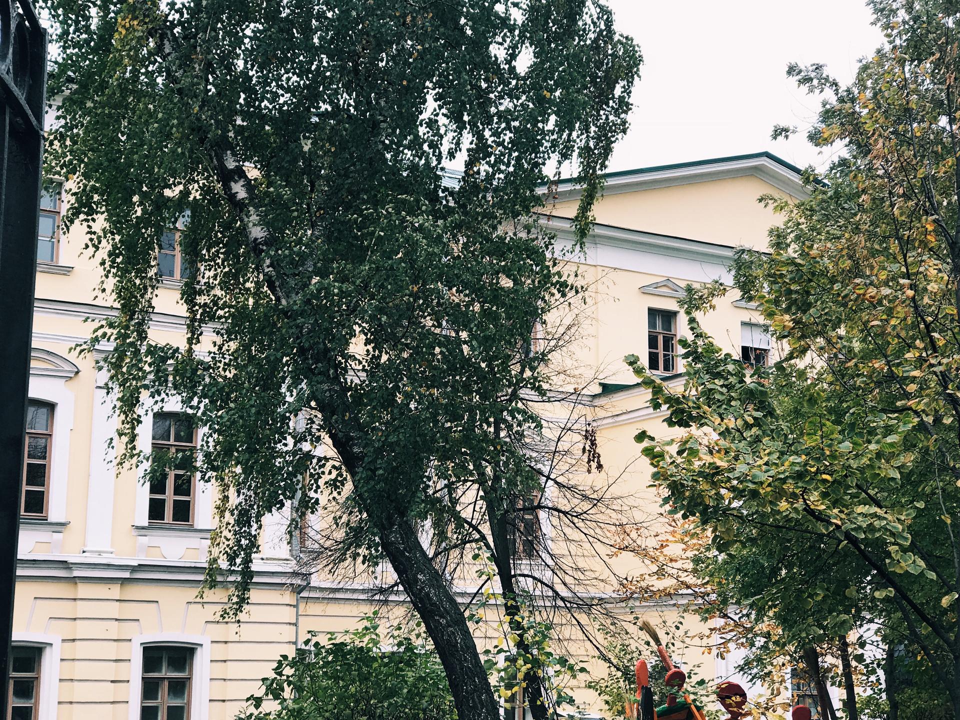 В 1810 г. всю усадьбу у тайного советника В.Н.Зиновьева за 30 тысяч рублей выкупил купец Ф.Ланг, который сдавал множество отдельных строений на большом участке жильцам и различным учреждениям. В нескольких флигелях, выходивших в Малый и Средний Кисловский переулки, после пожара 1812 г. временно разместилась Московская губернская гимназия (потом ее назвали Первой московской мужской казенной), пока ее дома на Волхонке ремонтировались. В ней учился М.П.Погодин, писавший в «Школьных воспоминаниях»: «Шесть комнат внизу – классы, вверху шесть комнат для учеников. По бокам квартиры для учителей, комнаты по две. Летом играли на большом дворе в лапту и ходили довольно часто на Воробьевы горы по праздникам». В 1818 г. у ее директора П.М.Дружинина жил поэт К.Н.Батюшков. В 1824 г. поселился композитор А.А.Алябьев.