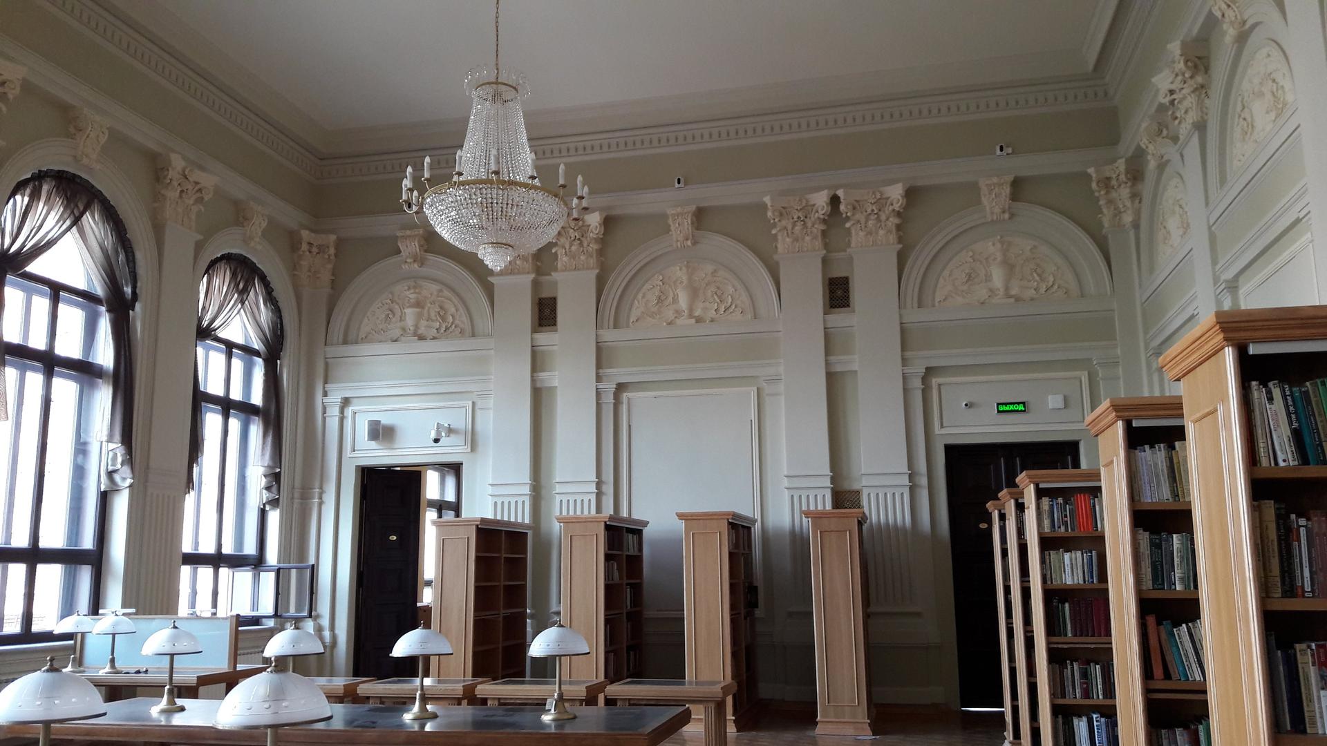 Реставраторы также восстановили историческую планировку и отделку помещений, воссоздали важные элементы интерьера. В частности, была проведена реставрация лепного декора в большом зале, восстановлены исторические столы и шкафы. Стены после снятия поздних наслоений цементной штукатурки и масляной краски перекрасили в выявленный в процессе натурных исследований первоначальный цвет.
